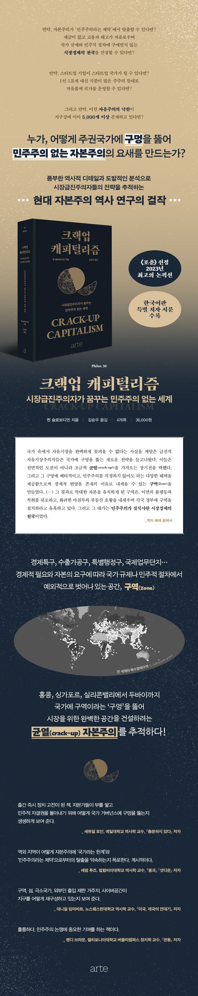 보스턴대학교 역사학 교수이자 전작 『글로벌리스트』로 학계와 언론의 뜨거운 주목을 받고 있는 역사학자 퀸 슬로보디언의 신간, 『크랙업 캐피털리즘』이 출간되었다. 이 책에서 슬로보디언은 주권국가에 시장을 위한 완벽한 공간을 찾으려는 시장급진주의자들의 역사를 추적하고, 그들이 사용하는 ‘구역’이라는 전략을 폭로한다. 구역(zone)이란 (경제특구나 수출가공구처럼) 경제적 필요와 자본의 요구에 따라 국가 규제나 민주적 절차에서 예외적으로 벗어나 있는 공간으로, 슬로보디언은 시장급진주의자들이 세계 곳곳에 구역이라는 ‘구멍’을 뚫어 자본의 탈출구를 건설하려 하고 있음을 지적한다. 신간에서 이러한 시도를 크랙업 캐피털리즘, 즉 ‘균열(crack up)의 자본주의’라 명명한 그는 가장 대표적인 구역이라 할 수 있는 홍콩과 싱가포르에서 시작해 런던, 실리콘밸리, 두바이, 소말리아 그리고 메타버스까지 차례차례 파헤친다.