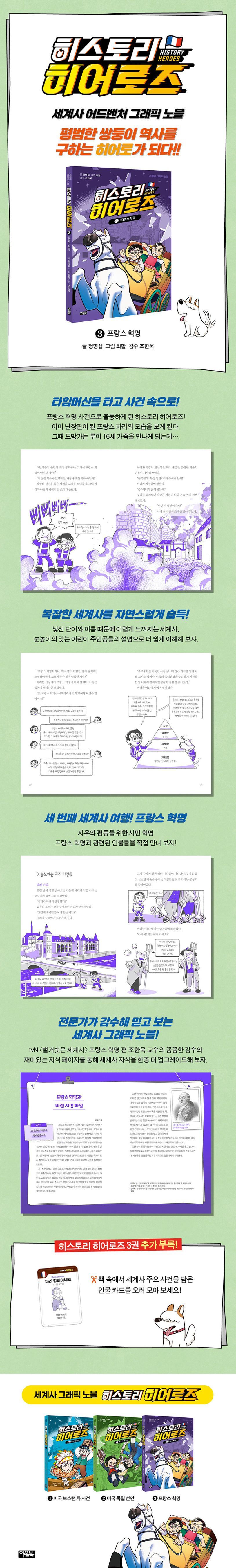 『히스토리 히어로즈』 시리즈는 역사적 사건을 돌아보며 당시 시대 흐름과 인물, 사회상을 생생하게 경험할 수 있는 세계사 판타지 그래픽 노블이다. 21세기 마지막 해, 전쟁과 환경 오염으로 파괴된 지구에 새로운 인류공동체 에코 시티가 생겨난다. 역사를 알 수 있는 자료가 모두 파괴된 에코 시티에서는 타임머신을 타고 과거로 가서 역사를 확인하고 현재로 돌아오는 히스토리 히어로즈가 탄생한다. 평범한 쌍둥이 남매였던 아리, 아랑은 어느 날 역사를 마음대로 바꾸겠다는 악당 타임 X에 맞서는 히스토리 히어로즈가 된다. 과연 쌍둥이는 타임 X를 물리치고 세계의 역사를 지켜낼 수 있을까?
