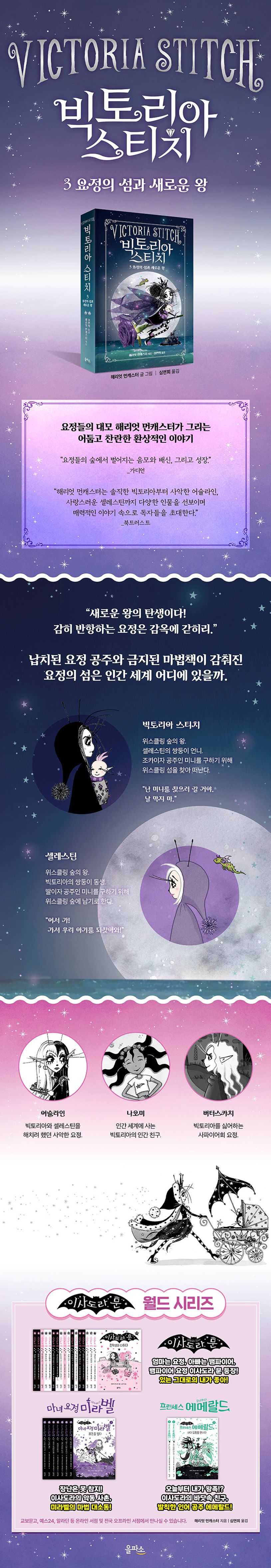 전 세계 베스트셀러 시리즈 〈이사도라 문〉과 〈마녀 요정 미라벨〉, 그리고 〈프린세스 에메랄드〉 시리즈를 통해 독특한 판타지 세계관을 구축하고 있는 작가 해리엇 먼캐스터의 〈빅토리아 스티치〉 3권이 2년 만에 출간되었다. 마침내 셀레스틴과 함께 요정 숲의 왕이 된 빅토리아. 그리고 태어난 새로운 다이아몬드 요정 공주. 위스클링 요정들의 크리스마스, 위스크마스를 앞둔 지금 가장 위험한 요정이 돌아왔다!