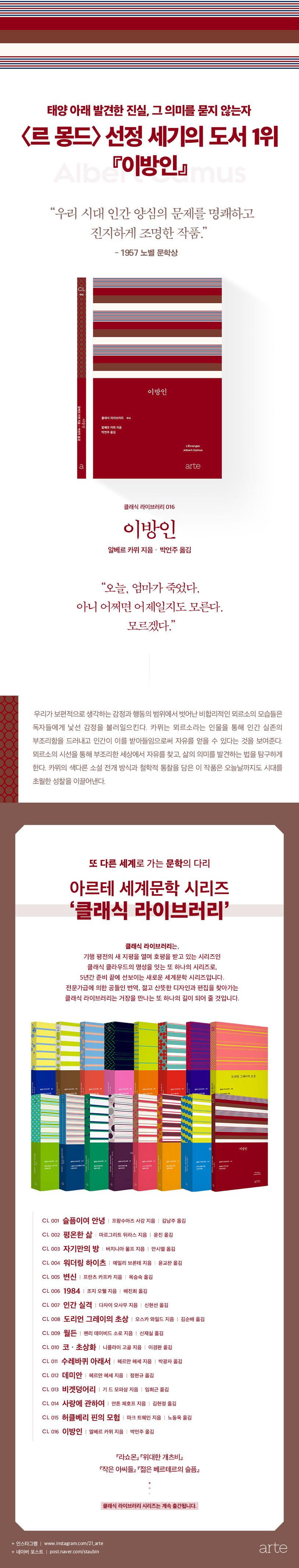 우리가 보편적으로 생각하는 감정과 행동의 범위에서 벗어난 비합리적인 뫼르소의 모습들은 독자들에게 낯선 감정을 불러일으킨다. 카뮈는 뫼르소라는 인물을 통해 인간 실존의 부조리함을 드러내고 인간이 이를 받아들임으로써 자유를 얻을 수 있다는 것을 보여준다. 뫼르소의 시선을 통해 부조리한 세상에서 자유를 찾고, 삶의 의미를 발견하는 법을 탐구하게 한다. 카뮈의 색다른 소설 전개 방식과 철학적 통찰을 담은 이 작품은 오늘날까지도 시대를 초월한 성찰을 이끌어낸다.
