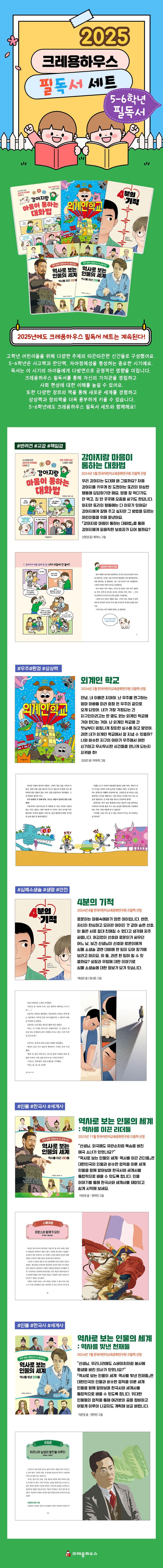 2025년에도 크레용하우스 필독서 세트는 계속됩니다! 초등 고학년 어린이들을 위해 다양한 주제의 따끈따끈한 신간을 모아 구성했습니다. 초등학교 5-6학년은 사고력과 판단력, 자아정체성을 형성하는 중요한 시기예요. 독서는 이 시기의 아이들에게 다방면으로 긍정적인 영향을 미칩니다. 크레용하우스 필독서를 통해 자신의 가치관을 정립하고 사회 현상에 대한 이해를 높일 수 있어요. 또한 다양한 장르의 책을 통해 새로운 세계를 경험하고 상상력과 창의력을 더욱 풍부하게 키울 수 있습니다. 5-6학년에도 크레용하우스 필독서 세트와 함께하세요.(크레용하우스 블로그와 인터넷 서점에서 독후활동지를 다운받을 수 있어요!)
