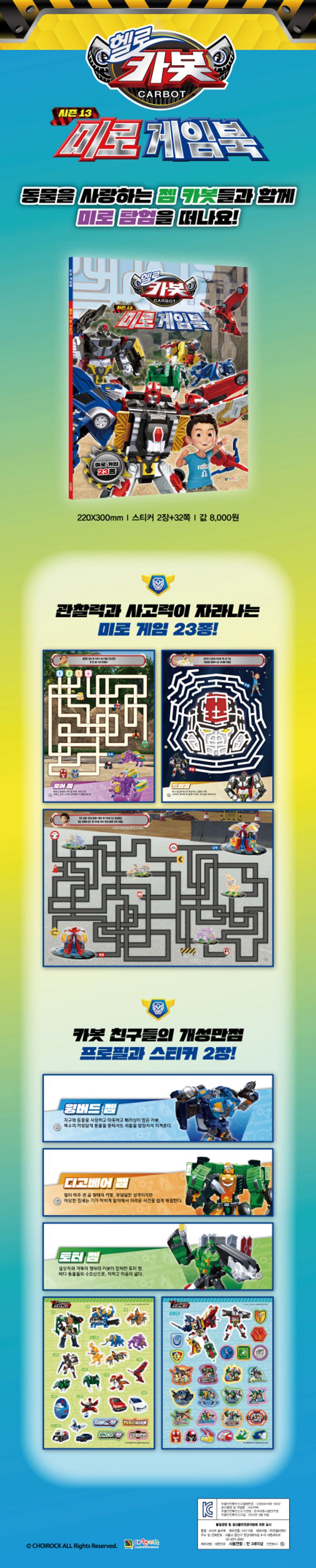 카봇 친구들과 다양한 형태의 미로 게임을 풀어보며 관찰력과 집중력을 키워 보세요. 미로 게임과 함께 수록된 카봇 친구들의 개성 넘치는 프로필은 카봇 친구들과 더 친해질 수 있는 기회가 될 거예요! 미로 게임과 함께 즐기는 2장의 스티커도 함께 만나 보세요.