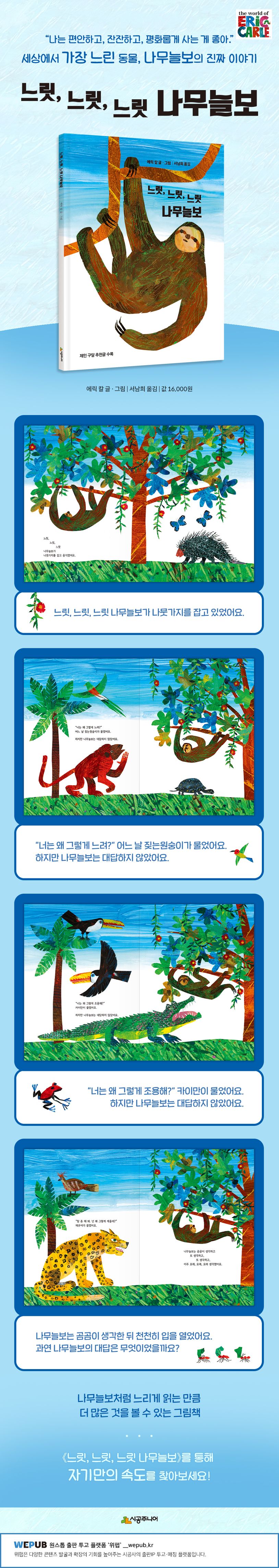 아마존 숲에 어느 나무늘보가 살았어요. 나무늘보는 느릿느릿 나뭇잎을 먹었어요. 또 느릿느릿 잠을 자고 천천히 깨어났다가 나무에 매달려 있었지요. 낮이고, 밤이고, 비가 와도 나무에 그대로 매달려 있었어요. 나무늘보는 왜 다른 동물처럼 빠르게 달려서 사냥하지 않는 걸까요? 생존을 위해 조금 더 날렵해지지 않아도 되는 걸까요?