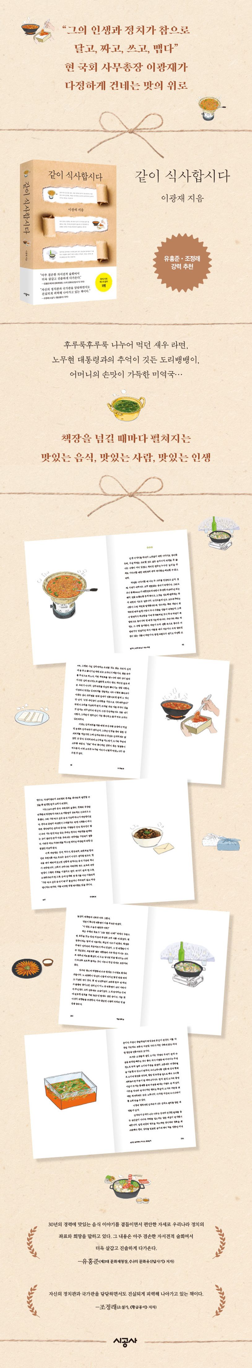 《같이 식사합시다》는 지난 2010년 지방선거에서 최연소 강원도지사를 역임하며 정치의 한복판으로 들어온 이광재 제35대 국회 사무총장이 대한민국 국민 모두에게 건네는 뜨거운 밥 한 끼 같은 책이자 10가지 음식에 깃든 자신의 인생 이야기를 에세이 형태로 맛있게 풀어낸 책이다. 새우 라면으로 시작해 열무김치에 이르는 과정을 따라가다 보면 우리는 인간 이광재가 그동안 걸어온 (정치적) 인생의 여로를 발견할 수 있다. 음식에 깃든 그의 인생을 함께 걷다 보면 음식을 만들 때처럼 여러 재료가 모여 각각의 맛을 내는 모습(개별성/다양성)과 그 각각의 맛들이 모여 하나의 맛을 이루어내는 모습(통합성)을 발견할 수 있다. 이는 곧 이광재가 경험했던 음식의 위로, 맛의 위로, 나아가 정치의 위로, 위로의 정치와도 궤를 같이할 것이다. 먹고사는 일에는 좌우가 없다. 급변하는 시대, 극단의 시대에 우리는 어떤 맛을 통해 위로받고 힘을 얻을 수 있을까. 책장을 넘길 때마다 펼쳐지는 맛있는 음식, 맛있는 사람, 맛있는 인생의 이야기들을 만나보자.