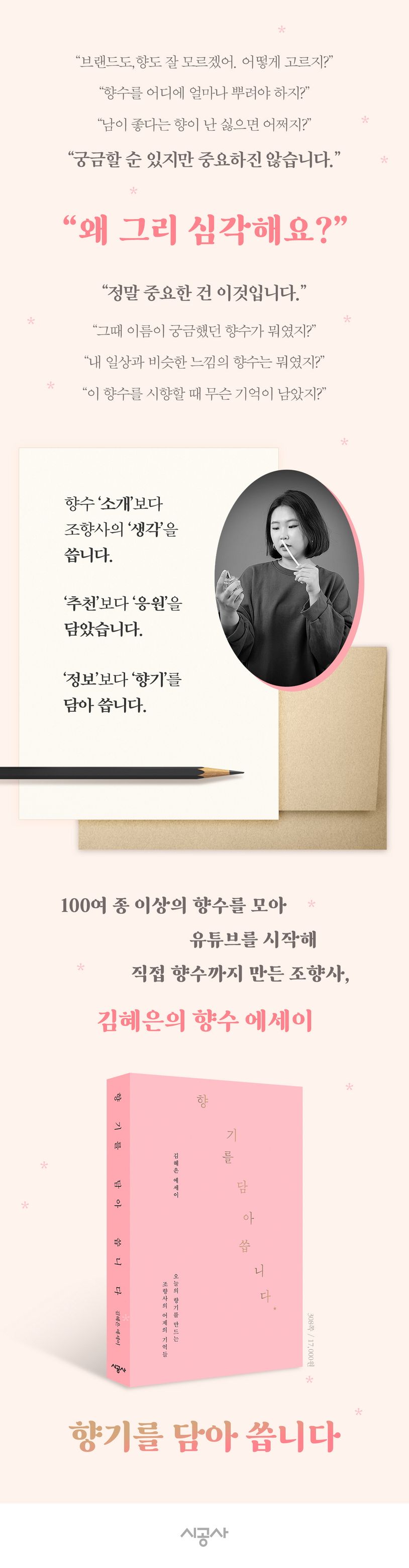 향수 ‘소개’보다 조향사의 ‘생각’을 쓴 책, ‘정보’보다 ‘향기’를 담아 쓴 책, ‘추천’보다 ‘응원’을 담은 《향기를 담아 씁니다》를 통해 당신은 향수 회사의 제품 설명, 유튜브 채널이 알려 주지 못한 ‘당신만의 향수’를 찾을 수 있을 것이다.