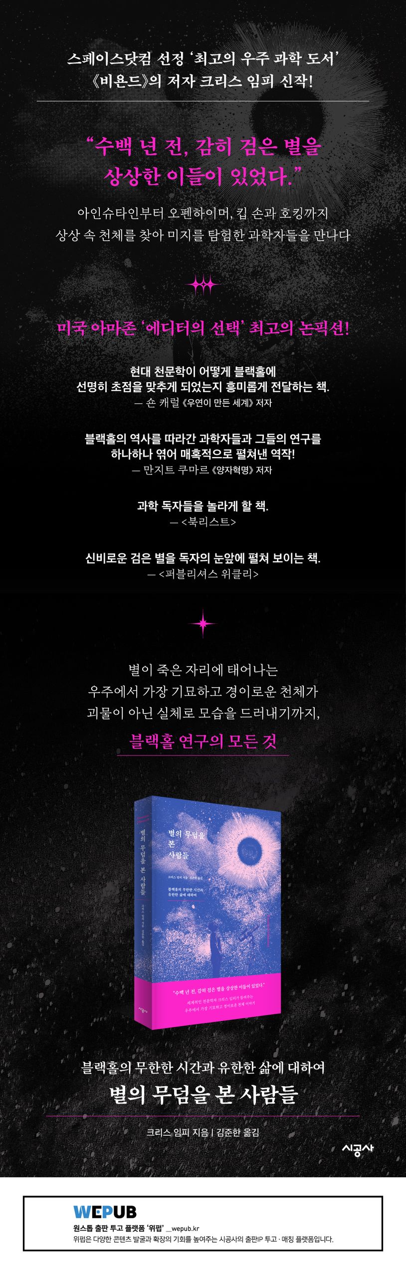 그러나 블랙홀은 실재한다. 블랙홀의 내부를 들여다보는 것은 불가능하지만, 우리는 블랙홀이 주변 천체나 우주에 미치는 영향을 통해 그것이 걸어온 길을 따라갈 수 있다. 세계적인 천문학자 크리스 임피는 이 책에서 블랙홀 연구의 과거와 현재, 미래를 논한다. 갈릴레이가 천체망원경을 고안한 이래, 수많은 과학자들이 호기심 어린 눈빛으로 이 미지의 천체를 추적해왔다. 우리는 불가사의하고 신비로운 검은 천체를 좇아 무모한 모험을 떠나고 기약 없는 연구를 기꺼이 감내한 과학자들을 만날 것이다. 별이 죽은 자리에 태어나는 블랙홀의 발자취를 따라, 별의 무덤에 마침내 도달한 사람들 말이다.