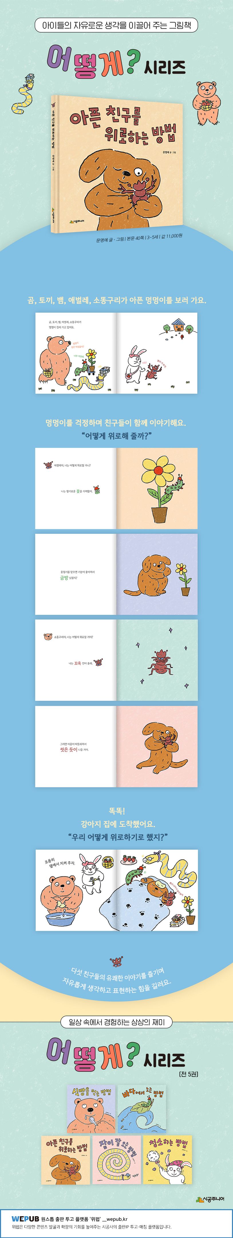 “애벌레야, 너는 어떻게 위로할 거니?” 소똥구리가 애벌레에게 물어요. 그러자 애벌레는 “나는 향기로운 꽃을 가져왔어. 꽃향기를 맡으면 기분이 좋아져서 금방 낫겠지?” 하고 말해요. 그러자 옆에 있던 곰, 토끼, 뱀, 소똥구리도 아픈 멍멍이를 위로할 방법을 상상하지요. 똑똑! 드디어 멍멍이 집에 도착했어요! “우리 어떻게 위로하기로 했지?”