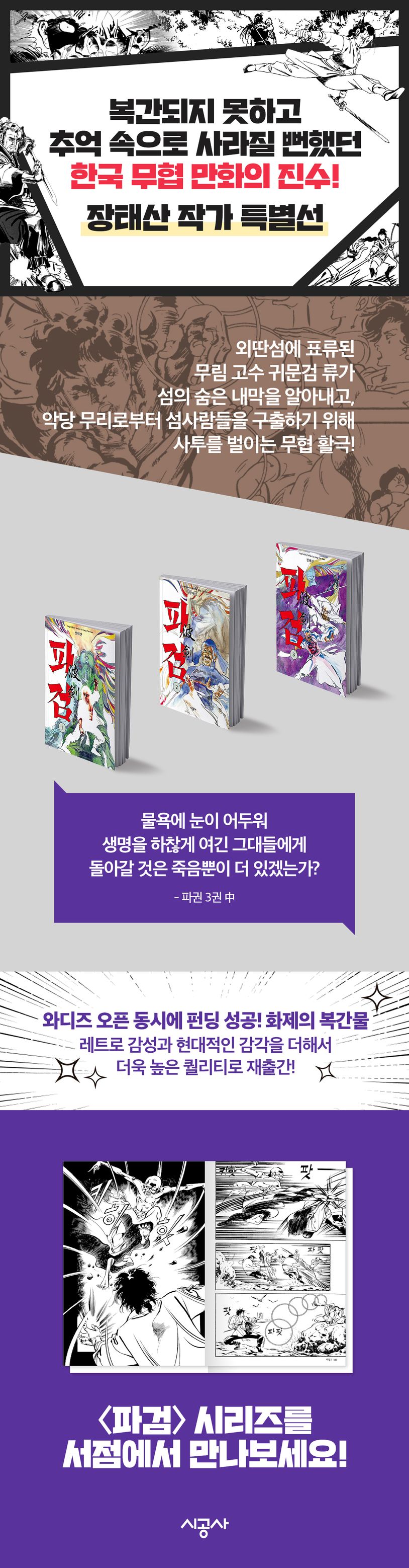 무림 고수 귀문검 류가 외딴섬에 표류되면서 여자들만 남아 있게 된 섬의 숨은 내막을 알아내고, 악당 황정첸과 그의 무리로부터 섬사람들을 구출하기 위해 사투를 벌이는 내용의 〈파검〉 시리즈가 38년 만에 재출간했습니다! (전 3권)