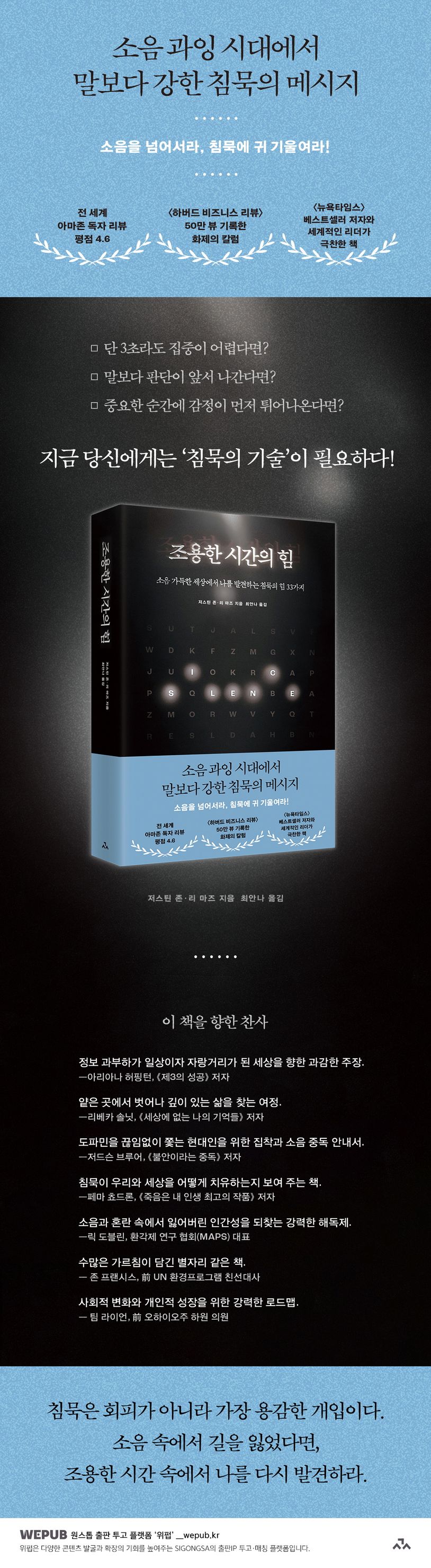 《조용한 시간의 힘》은 소음으로 지친 현대인을 위한 침묵 안내서다. 소음으로 가득한 세상에서 침묵을 발견하고, 최고의 나를 찾을 수 있는 법을 알려 준다. 〈하버드 비즈니스 리뷰〉 화제의 칼럼에서 출발한 이 책은 단순히 소음의 부재가 아닌 존재로서의 침묵을 탐구하며, 과학·철학·종교·일상에서의 다양한 관점에서 침묵의 가치와 가능성을 조명한다. 정치인, 종교인, 예술가, 신경과학자 그리고 평범한 사람들의 이야기를 통해 침묵이 어떻게 우리 삶의 속도를 늦추고, 소음으로부터 주의를 회복하며, 더 나은 사회와의 연결을 만드는지 보여 준다. 이 책은 소음으로 가득한 일상에서 내면의 평온을 찾고자 하는 사람들에게, 침묵의 의미와 가치를 탐구하고 진정한 회복을 원하는 이들에게 말보다 강한 침묵의 메시지로서 조용한 혁신의 시작점이 될 것이다. 이 책은 침묵이 개인, 가족, 직장, 나아가 사회에 왜 필수적인지를 짚으며, 조용함의 의미를 새롭게 바라보고 더 깊이 듣고, 더 잘 사는 길을 제시한다.