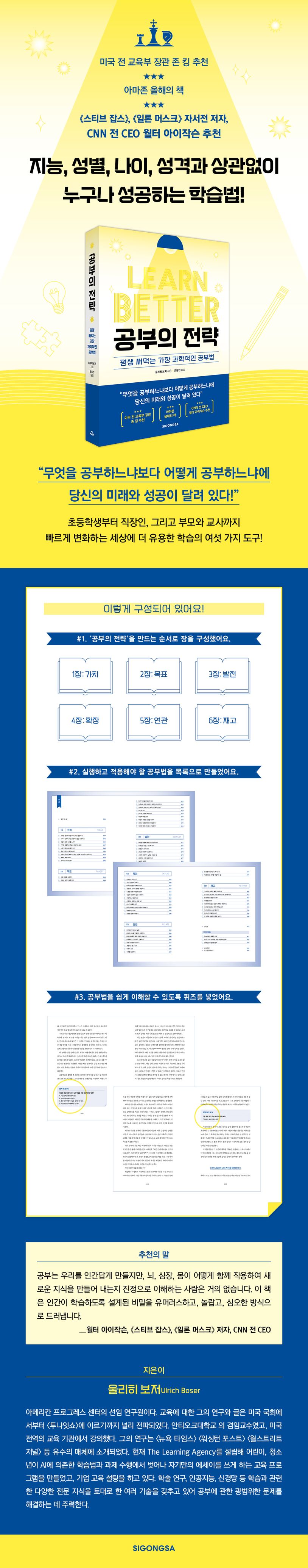 《공부의 전략》을 쓴 학습 전문가 울리히 보저는 어린 시절 학교가 포기한 어린 아이였다. 그러나 그는 아이비리그를 졸업했고, 이후 학습 컨설팅 회사의 CEO가 되어 어린이부터 기업에 이르기까지 공부를 위해 반드시 알고 있어야 할 6단계의 도구를 알려준다.