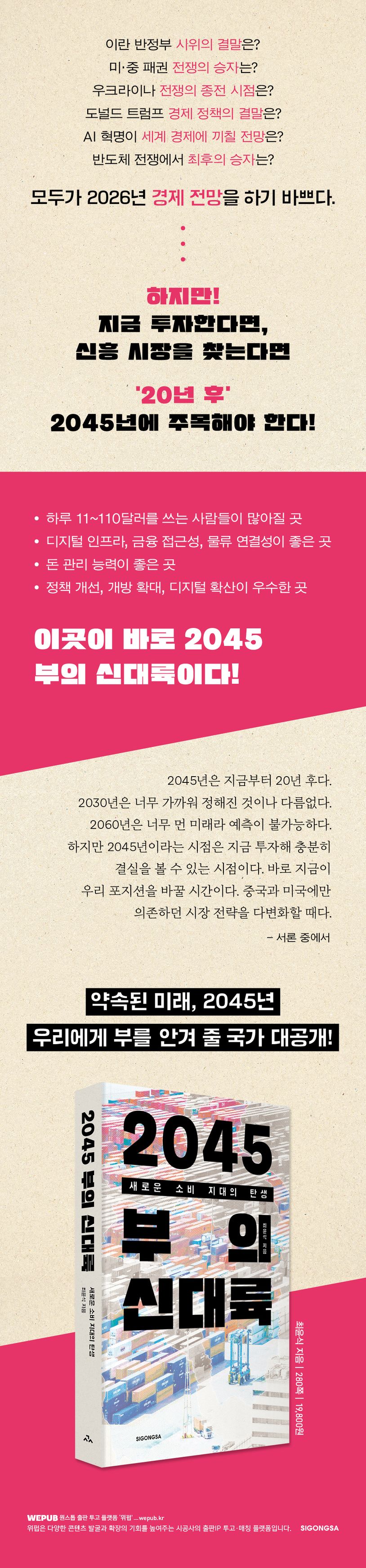 이 책의 목적은 막연한 기대를 조장하는 것이 아니다. 2045년은 지금부터 ‘20년 후’다. 2030년은 너무 가까워 정해진 것이나 다름없다. 2060년은 너무 먼 미래라 예측이 불가능하다. 하지만 2045년이라는 시점은 지금 투자한다면 충분히 결실을 볼 수 있는 미래다. 부의 지형도가 바뀌는 시점이기도 하다. 짧게는 3년, 길게는 10년이 한국의 20~30년 후 미래를 좌우할 것이다. 바로 지금이 우리 포지션을 바꿀 시간이다. 중국과 미국에만 의존하던 시장 전략을 다변화할 때다. 2045년에 돈이 몰릴 곳을 선점할 시간이다.