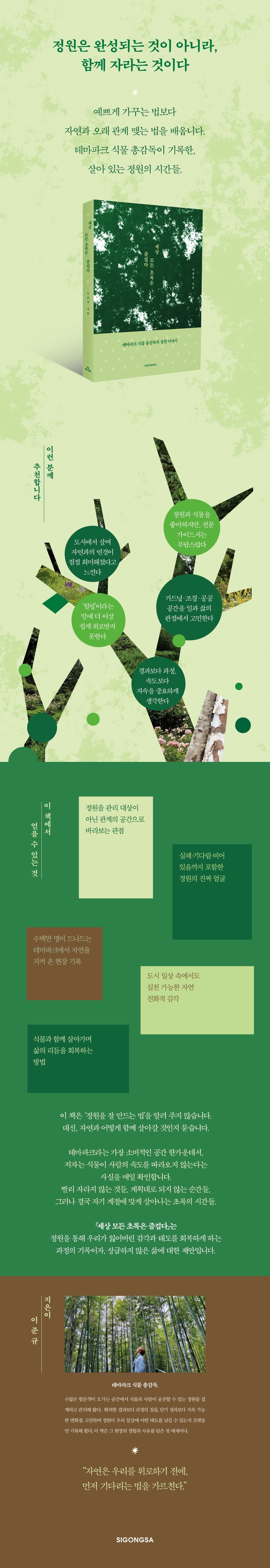 꽃도사람이있어야꽃이다액자를깨고나온정원이우리삶을바꾸는순간이책의중심에는“꽃도사람이있어야꽃이다”라는문장이놓여있다.한시인의어머니가남긴어록에서출발하였던이메시지는저자가오랜시간정원을만들고관찰하며도달한핵심적인결론이기도하다.울타리안에서보호받으며감상만되는꽃은더이상살아있는정원이아니라는문제의식은,우리가익숙하게받아들여온정원문화전반을다시보게만든다.저자는테마파크정원에서실제로울타리를걷어내고,사람과꽃이자유롭게만날수있는환경을조성한다.사람을막아꽃을지키는대신,사람을믿는선택을한것이다.그결과는파괴가아니라변화였다.방문객들은꽃을더조심스럽게대했고,정원은계절과시간의흐름을온전히드러내는살아있는공간으로바뀌었다.이경험은정원이결과물이아니라과정이며,통제가아니라관계위에서완성된다는사실을증명한다.또한이책은정원을기획하고돌보며가꾸는‘가든메이커’라는존재를정원의주변부가아닌핵심요소로끌어온다.정원에서일하는사람의손길과시간이드러날때,정원은비로소콘텐츠이자문화가된다.『세상모든초록은즐겁다』는정원을통해자연과인간이어떻게공존할수있는지를보여주며,속도와효율에지친현대인에게‘함께자라는아름다움’의의미를조용히일깨운다.책속에서다양한형태가만들어지고있지만앞으로정원은일차원적아름다움의소비가아닌,한층더깊은아름다움으로가장순수한즐거움을주는사적인공간이될것이다.한번에완성되는곳이아니라태어나고성장하고쇠퇴하는일련의과정이동시에나타나는,살아있는생명체로정의되어야할것이다.[...]정원은가장평등한공간이다.내가씨앗을뿌리든우리집막내가씨앗을뿌리든똑같이싹을틔우고환경과소통하며정원이성장해간다.-프롤로그“정원의본질은당신의삶속에있다”에서다가가려는고객과이를막으려는관리자들의지루한싸움을끝내기위해더높고튼튼한울타리를만드는대신역으로걷어내기로결정했다.인간의본성이기본적으로‘아름다운것을파괴하는것이아닌소중히대하고싶어한다’는믿음을가지고시작했다.[...]오히려사람들은꽃을가까이서볼수있게되자더욱조심해서사진을찍었고조심스레산책을했다.사람과꽃사이의경계를허무니비로소정원이액자를박차고나와살아숨쉬는공간이되기시작하고사람들과소통하기시작한것이다.자유를경험한정원이마음껏성장하면서그곳을즐기는사람들,그곳을만드는사람들도함께성장할것이다.이것이정원의혁신이아니면무엇이혁신이라할수있을까?-1장“사람과함께성장하는정원”에서분명꽃이외에도눈여겨볼만한부분이훨씬많다.이파리도세상모든초록이감히따라가지못할깊이의색감을사계절보여준다.무심히는그저단순한초록으로보일수있지만실제로매우다채롭다.물론꽃도예쁘지만,몰라서자세히보지못했을줄기와잎을전면에내세워식물본연의미를,다양함으로지속가능한아름다움을정원에서선보여야겠다고생각했다.-2장“아름다움은함께자라는것”에서이렇게동적이고자극적인공간에서정원이살아남으려면그이상의자극이필요했다.해마다트렌디한콘셉트가만들어지고그에걸맞은거대한조형물을설치해서사람들의시선을끌려고노력했다.그렇듯모두가시선을끌고자애쓰는이비일상의장소에서,완전히다른결을지닌정적이고평화로운공간이오히려가장강력한자극이되리라확신하게됐다.-3장“자연스러움이가장큰디자인이다”에서에버랜드의꽃축제를진행하는포시즌스가든은자연농원시절전시형잔디밭으로시작해서꽃축제를진행하면서전시형화단으로,다음으로는관람형화단,그리고테마형정원으로진화해왔다.나아가단순한꽃전시에머무르지않고식물과사람과의다양한소통을통해즐거움을극대화하는정원으로진화하기를바랐다.이름하여‘퍼포먼스정원’이다.멈춰서서꽃을바라보고,꽃의이야기를듣고느끼는생동감있는정원.-4장“모든과정이피어나는풍경”에서화려하게가득채우거나피로감이느껴지는정원이아닌식물과식물,식물과사람,사람과사람의적당한거리두기를통해정원의아름다운과가치를한단계더올려보고싶었다.그래서2021년도연출방향을“공간은비우고꽃은채운다”로정했다.꽃과꽃을조금떨어뜨려보기로했다.그해봄,튤립축제를기획하면서스태프들에게도꽃사이사이공간을두면서식재를하도록가이드를줬다.비우면서도풍성함이느껴지는정원을위해고민하다가몇가지아이디어를냈다.-5장“비워야채워지는정원의시간”에서정원은개인의기억이차곡차곡쌓여특유의정체성을만드는장소이다.가장나다운모습을발견할수있는공간인것이다.더구나집단의기억이켜켜이쌓인테마파크는가장정직한시대상이발견되는곳이기도하다.[...]너무무겁게정원을만들어왔는지모르겠다.거창한“무슨무슨주의”정원이아닌생활과함께하는생활주의정원을만들면서조금더편안하게정원을만들면서즐겁고행복했으면좋겠다.이즐거운길을많은사람들과함께정말즐겁고행복하게걸었으면좋겠다.-에필로그“끝도없는길을가볍고즐겁게걷다”에서