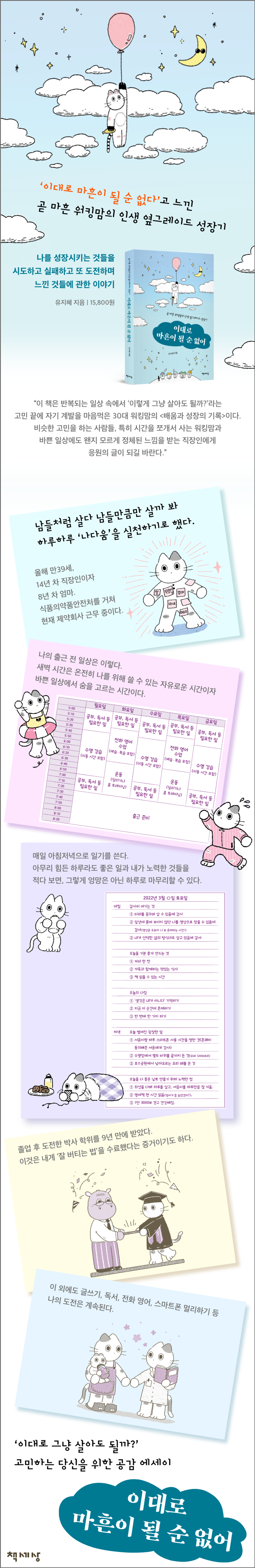 이 책은 ‘이렇게 그냥 살아도 될까?’라는 인생의 고민 끝에 자기계발을 맘먹은 30대 워킹맘의 〈배움과 성장의 기록〉이다. 비슷한 고민을 하는 사람들, 특히 자신처럼 시간을 쪼개서 사는 워킹맘과 바쁜 일상에도 왠지 모르게 정체된 느낌을 받는 직장인에게 응원의 글이 되길 바란다.