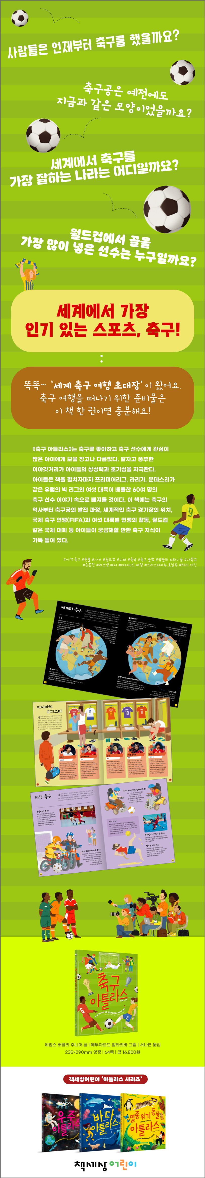 이 책《축구 아틀라스》는 축구를 좋아하고 축구 선수에게 관심이 많은 아이에게 보물 창고나 다름없다. 알차고 풍부한 이야깃거리가 아이들의 상상력과 호기심을 자극한다. 아이들은 책을 펼치자마자 프리미어리그, 라리가, 분데스리가 같은 유럽의 빅 리그와 여섯 대륙이 배출한 60여 명의 축구 선수 이야기 속으로 빠져들 것이다. 이 책에는 축구의 역사부터 축구공의 발전 과정, 세계적인 축구 경기장의 위치, 국제 축구 연맹(FIFA)과 여섯 대륙별 연맹의 활동, 월드컵 같은 국제 대회 등 아이들이 궁금해할 만한 축구 지식이 가득 들어 있다.