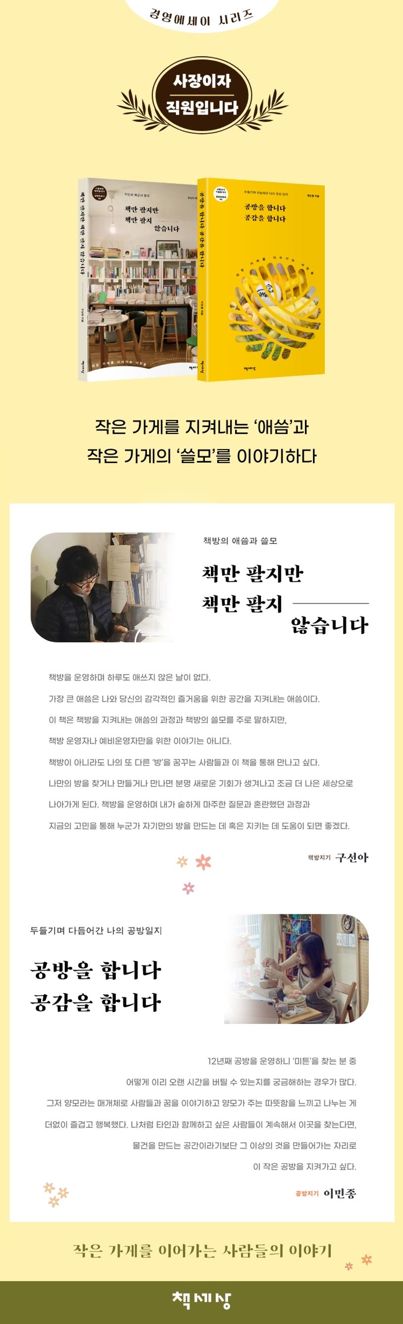이 책은 책방 운영자나 예비운영자만을 위한 이야기는 아니다. 저자는 이 책을 쓰기로 했을 때 가장 먼저 ‘자기만의 방’을 꿈꾸는 독자를 상상했다. 책방이 아니라도 자신의 또 다른 방을 꿈꾸는 사람들과 만나고 싶었다. 자기만의 방을 찾거나 만들거나 만나면 분명 새로운 기회가 생겨나고, 조금 더 나은 세상으로 나아가게 된다.