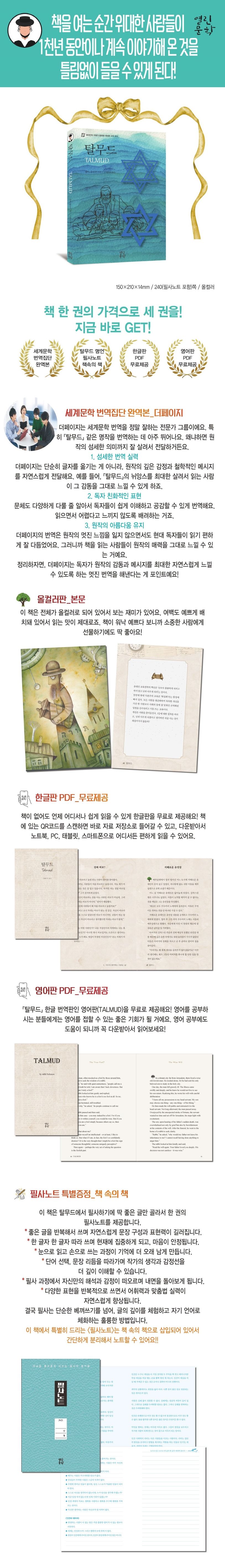 탈무드는 유대인의 정신이다. 유대인이 탈무드를 지켜 온 것이 아니라 어쩌면 탈무드가 유대인을 지켜 주었다고 말할 수도 있다.