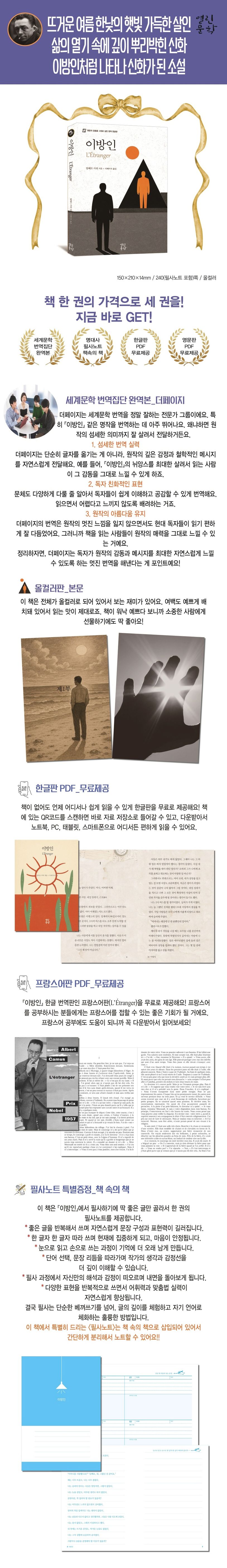 느끼고 존재한다는 진실은 가장 소극적인 진실이지만 그것 없이는 자아와 세계에 대한 그 어떤 통찰도, 정복도 불가능하다고 카뮈는 말한다. 20세기 최고의 문학적 사건이자 전후 최고의 걸작으로 손꼽히는 이 작품은 알제리 출신의 무명 작가 카뮈를 단번에 유럽에서 가장 유명한 작가로 만들었고 20대에 벌써 노벨 문학상 후보로 거론되게 했다.