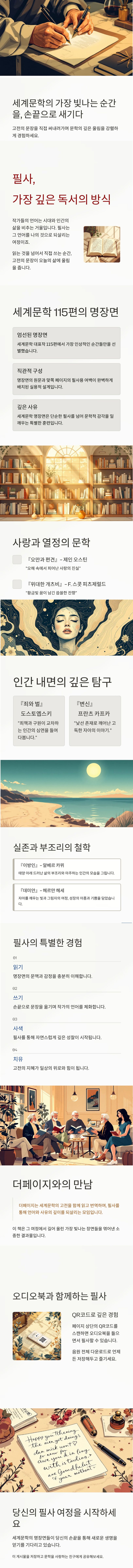 마지막으로,필사는자기자신을위한선물이다.필사노트가한장,두장채워질수록그안에는누군가의언어가아니라,‘내가감동한세계’가담기게된다.필사는결국나를쓰는일이다.타인의문장으로나의마음을써내려가는,가장조용하고아름다운독서법이다.