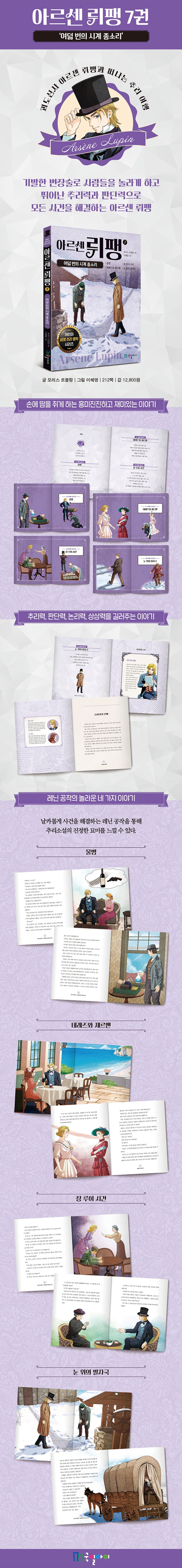 《아르센 뤼팽》 7권 ‘여덟 번의 시계 종소리’는 뤼팽을 닮은 레닌 공작과 탐정을 꿈꾸는 오르탕스가 함께 한 여덟 번의 모험 이야기 중에서 ‘물병’, ‘테레즈와 제르맨’, ‘장 루이 사건’, ‘눈 위의 발자국’ 등 흥미진진한 이야기 네 편을 담았다.