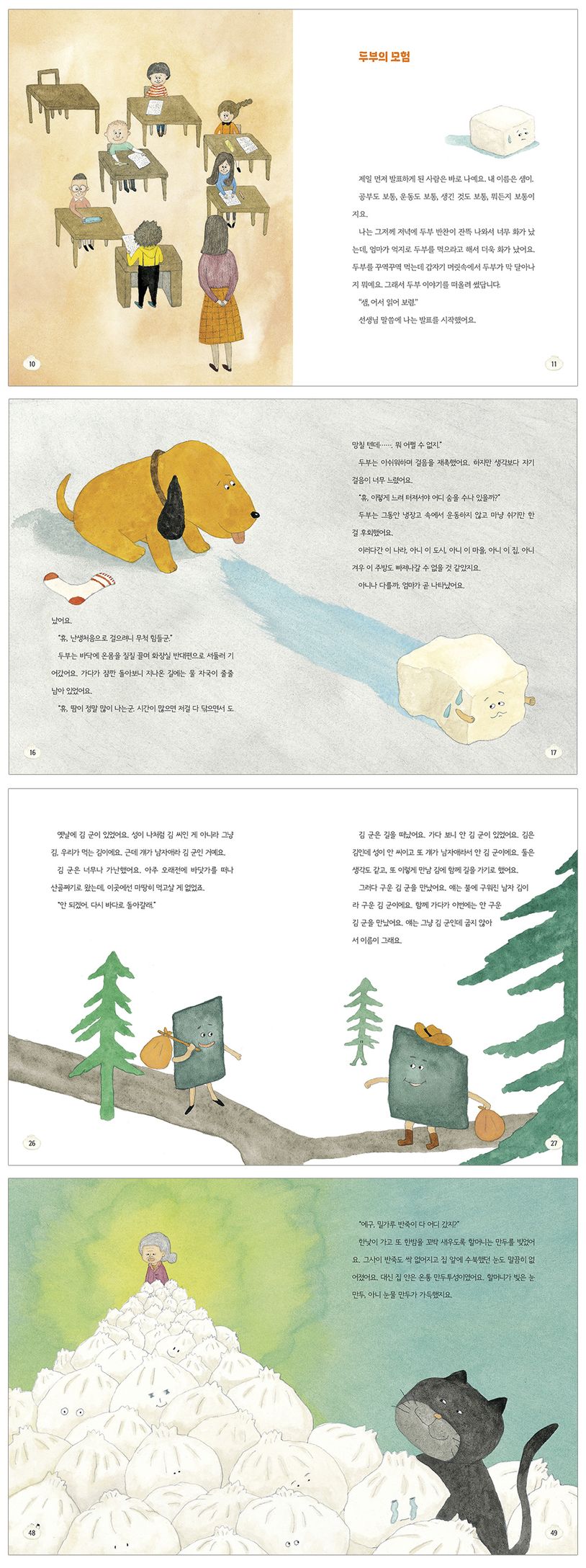 수선화 반 담임 선생님은 아이들에게 새로운 숙제를 내줍니다. 매일 먹는 음식으로 동화를 한 편씩 써 보라고 하지요. 무섭고 날카로운 부엌칼을 피해 탈출을 시도하는 두부의 모험 이야기, 바다로 돌아가기 위해 모인 수많은 김 군 이야기, 따끈따끈한 만두처럼 알차고 포근한 사랑이 느껴지는 눈물 만두 이야기 등 천방지축 개구쟁이 아이들이 전하는 이야기는 어른들의 이야기보다 더욱 익살스럽고 가슴 찡한 감동을 전해 줍니다. 어린 독자들은 책을 읽으며 마치 자신의 이야기, 바로 옆 친구의 이야기를 보듯 쏙 빠져들어 함께 울고 웃을 것입니다.