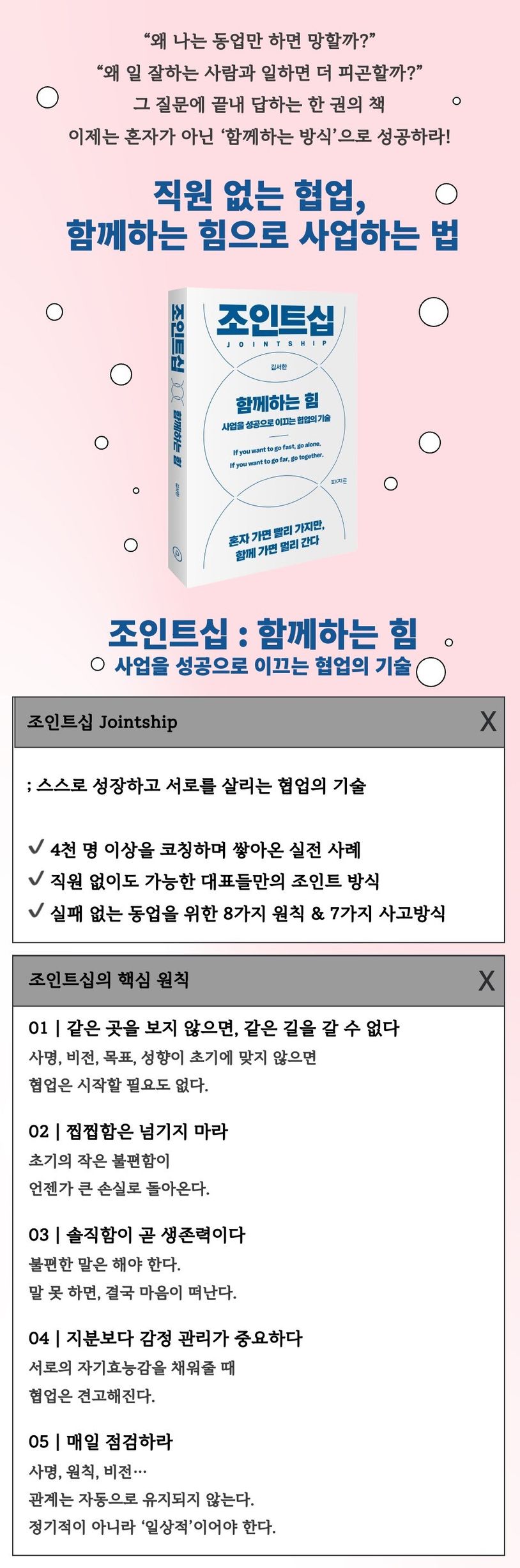 조인트십은 단순한 동업이나 파트너십을 넘어선 개념으로, 신뢰와 정직을 바탕으로 한 협력 관계를 구축하여 지속 가능한 성장을 이루는 방법론을 제시한다. 김서한 작가는 책에서 정직함이 협업의 가장 중요한 가치임을 강조하며, 협력 파트너 간 투명하고 진정성 있는 소통이 성공의 열쇠라고 설명한다.