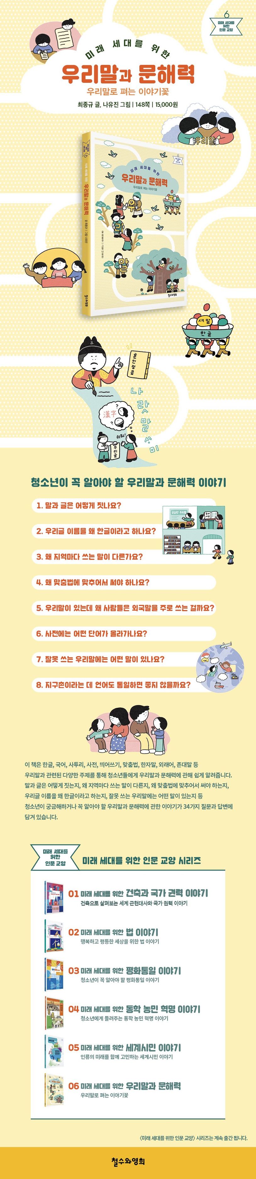 말과 글은 어떻게 짓는지, 왜 지역마다 쓰는 말이 다른지, 왜 맞춤법에 맞추어서 써야 하는지, 우리글 이름을 왜 한글이라고 하는지, 잘못 쓰는 우리말에는 어떤 말이 있는지 등 청소년이 궁금해하거나 꼭 알아야 할 우리말과 문해력에 관한 이야기가 34가지 질문과 답변에 담겨 있다.