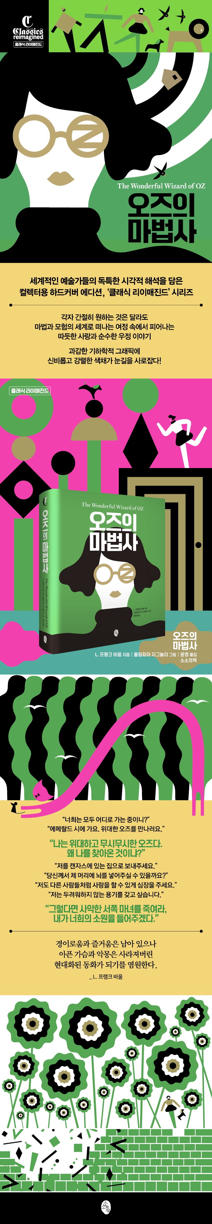 이 책은 저자인 L. 프랭크 바움이 서문에서 밝혔듯이, 어린이들을 오로지 즐겁게 해줄 생각으로 아픈 가슴과 악몽은 사라져버린 동화가 되기를 바라는 염원을 담고 있다. 이 순수하고도 감성적인 이야기는 각자가 소망하는 바를 이루기 위해 위대하고 무시무시한 오즈가 살고 있다는 에메랄드 시를 찾아가는 험난하고 위태로운 여정, 그리고 시시각각 일행이 맞닥뜨리는 여러 상황과 반전의 묘미가 어우러진다. 한 세기가 지나도록 수많은 뮤지컬과 영화 등으로도 각색되어 여전히 전 세계인의 사랑을 받고 있는 명작의 컬렉터용 버전인 이 책은 그동안 다채로운 컬러로 많은 이들의 눈길을 사로잡은 올림피아 자그놀리의 매력적인 이미지가 더해져 비밀이 가득한 환상의 세계로 데려다준다.