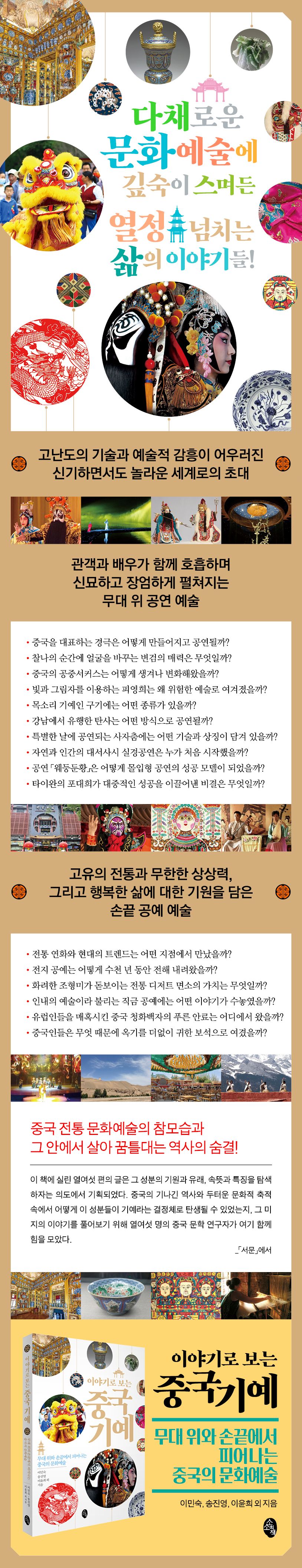 이책에서다루는중국전통기예의특징중하나는민간에서성행하고전승되었다는점이다.각각의기예가오늘날까지많은사람들의사랑을받고세계가공인하는문화유산으로인정받기까지는무명의예인과배우,도공,시골아낙네등의굳건한의지와고군분투하는열정이있었기에가능했다.따라서그들의이야기는기예의역사를대변해줄뿐만아니라전통문화예술에좀더친근하게다가갈수있게해준다.또한서로다른지역,문화,민족간이동과교류가기예의발전을추동했다는점에주목할필요가있다.한지역에서다른지역으로옮겨가새롭게꽃피우거나,어떠한계기로이질적인요소가유입되어융합되는것은곧인류문화의발전법칙이기도하다.대륙에서섬으로건너간포대희를비롯해아시아각국의다채로운사자춤,유럽으로수출된도자기등은그대표적인사례이다.현대사회로들어서면서기예가전통을고수하기보다는새로운변신을모색하는양상도눈여겨볼만한부분이다.서커스와스토리의결합,디지털기술을활용하는공연,굿즈상품출시와다양한매체로의확장,전통공예품의관광상품화등은중국기예가나아갈새로운미래를보여주고있다.