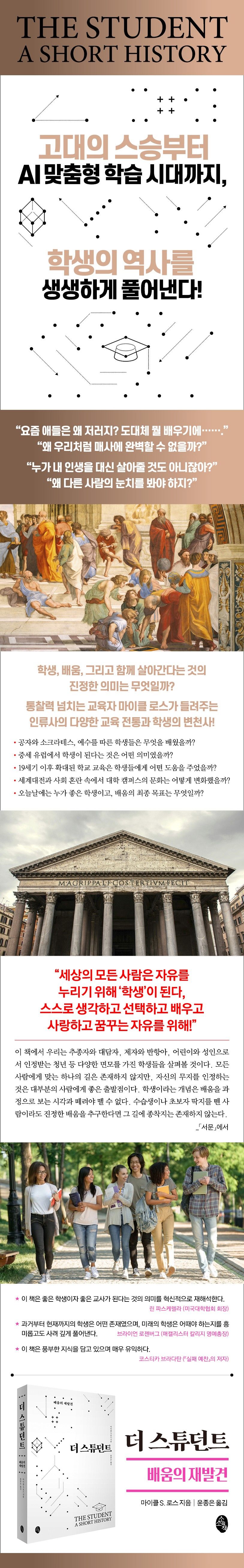 사람은 태어나면서부터 끊임없이 배우며 살아간다. 그 배움의 주체가 바로 ‘학생’이다. 그럼에도 우리는 학생이라는 존재에 대해 얼마나 알고 있을까? 그리고 우리는 왜 무언가를 배워야만 할까? 세계적인 교육 혁신가이자 역사학자인 마이클 로스는 이 책에서 교육이라는 큰 틀 아래서 고대의 위대한 스승인 공자, 소크라테스, 예수에서 출발해 중세의 도제 교육, 근대의 계몽과 제도화된 학교 교육의 변화, 그리고 20세기와 21세기의 대학 캠퍼스에 이르기까지 다양한 맥락에서 발전해온 학습 모델을 폭넓게 탐구한다. 그와 함께 배움을 통해 스스로 생각하는 능력을 키우고, 독립적인 존재로 성장하며, 진정한 자유에 이르는 길이 무엇인지 통찰한다. 학생이란 무엇이고, 학생이 된다는 것은 어떤 의미이며, 학생이라는 정체성이 우리 사회의 가치를 어떻게 반영하는지는 곧 우리 모두에게 새로운 인식의 전환을 불러일으킬 것이다.