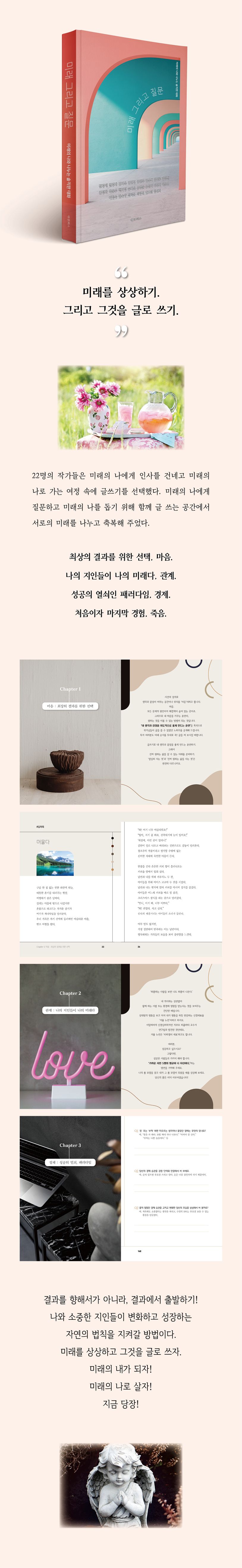 미래를상상하고그것을글로쓰자.22명의작가들은미래의나에게인사를건네고미래의나로가는여정속에글쓰기를선택했다.미래의나에게질문하고미래의나를돕기위해함께글쓰는공간에서서로의미래를나누고축복해주었다.최상의결과를위한선택,마음.나의지인들이나의미래다,관계.성공의열쇠인패러다임,경제.처음이자마지막경험,죽음.이책을선택한독자들이여!그대의미래를소중히여기는마음으로즐겁게독서해주길바란다.그리고작가들의미래를응원해주길바란다.글한편이끝날때마다던지고있는그대의미래를위한질문에도답하길바란다.각챕터를시작하기전마다미래를상상하며글쓸수있는구조와예시글도소개해두었다.그대의미래를축복하면서진심으로잘되길바라며그대또한반드시글을써보자.미래를상상하기.그리고그것을글로쓰기.결과를향해서가아니라,결과에서출발하기!나와소중한지인들이변화하고성장하는자연의법칙을지켜갈방법이다.미래를상상하고그것을글로쓰자.미래의내가되자!미래의나로살자!지금당장!