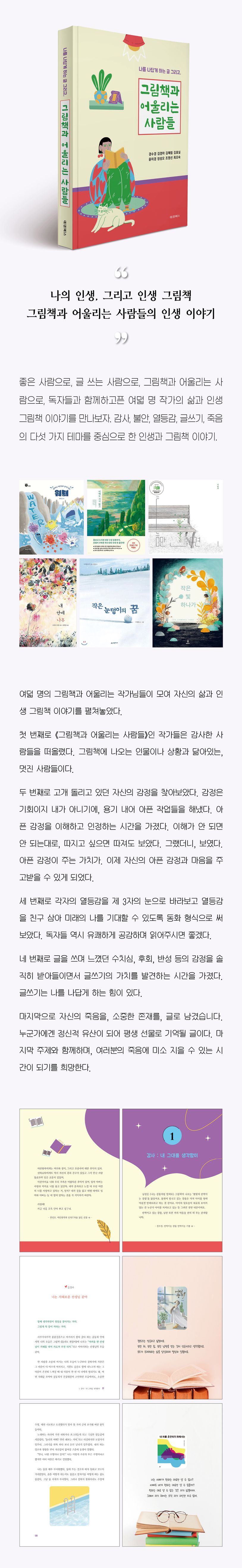 좋은 사람으로, 글 쓰는 사람으로, 그림책과 어울리는 사람으로, 독자들과 함께하고픈 여덟 명 작가의 삶과 인생 그림책 이야기를 만나보자. 감사, 불안, 열등감, 글쓰기, 죽음의 다섯 가지 테마를 중심으로 한 인생과 그림책 이야기.