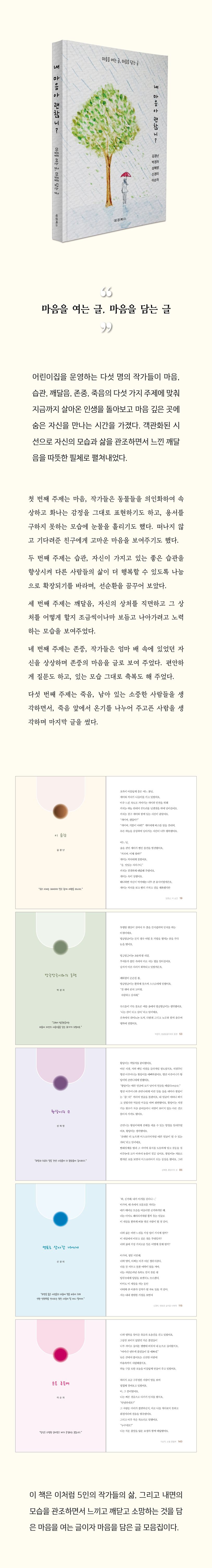 어린이집을 운영하는 다섯 명의 작가들이 마음, 습관, 깨달음, 존중, 죽음의 다섯 가지 주제에 맞춰 지금까지 살아온 인생을 돌아보고 마음 깊은 곳에 숨은 자신을 만나는 시간을 가졌다. 객관화된 시선으로 자신의 모습과 삶을 관조하면서 느낀 깨달음을 따뜻한 필체로 펼쳐내었다.