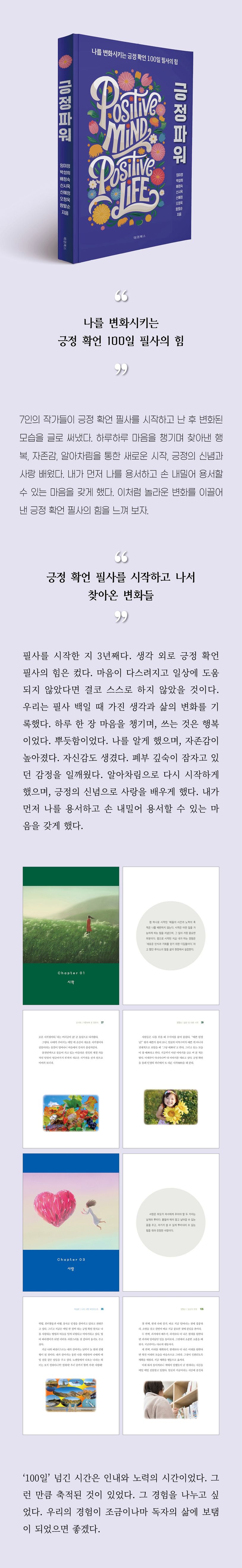 7인의 작가들이 긍정 확언 필사를 시작하고 난 후 변화된 모습을 글로 써냈다. 하루하루 마음을 챙기며 찾아낸 행복, 자존감, 알아차림을 통한 새로운 시작, 긍정의 신념과 사랑 배웠다. 내가 먼저 나를 용서하고 손 내밀어 용서할 수 있는 마음을 갖게 했다. 이처럼 놀라운 변화를 이끌어낸 긍정 확언 필사의 힘을 느껴 보자.