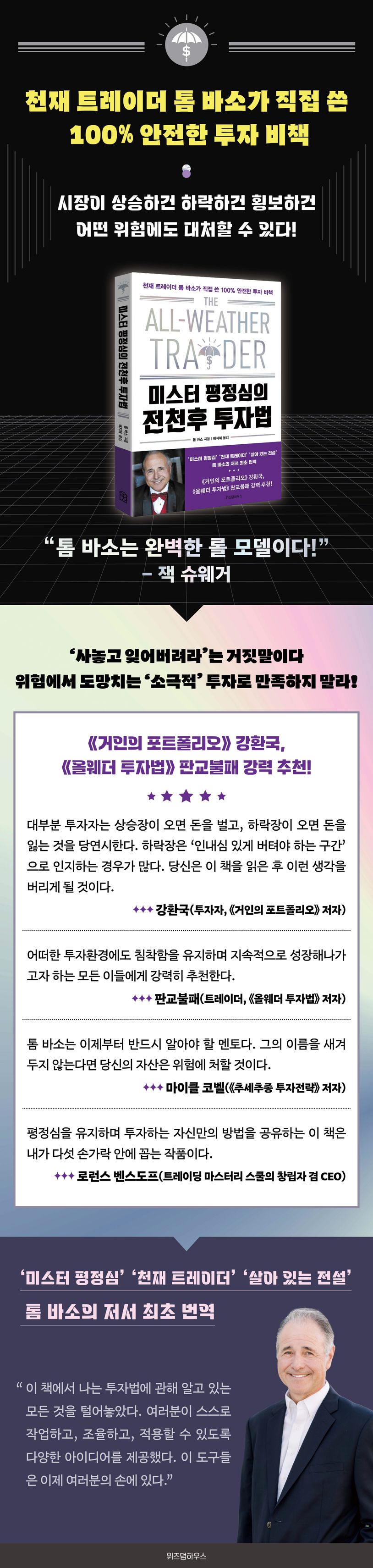 코로나19 팬데믹, 러시아-우크라이나 전쟁, 이스라엘-팔레스타인 분쟁 등 주식이나 부동산을 비롯한 투자 시장을 위협하는 불확실성은 커지고, 위험은 더욱 늘었다. 침착하면서도 흔들리지 않는 투자로 잭 슈웨거로부터 ‘미스터 평점심’이라는 별칭을 얻은 천재 트레이더 톰 바소는 시장의 위험은 늘 존재하고 “위험에서 도망칠 수 있는 투자자는 없다”고 말한다. 하지만 그에 따르면 위험을 관리하는 것은 가능하다. ‘천재 트레이더’ ‘살아 있는 전설’이라 불리는 톰 바소의 투자법을 따라가다 보면 많은 시간을 쓰지 않아도 자신이 원하는 보상을 얻으면서 무슨 일이 닥칠지 걱정하지 않고, 매일 밤 두 다리를 쭉 뻗고 잘 수 있을 것이다.