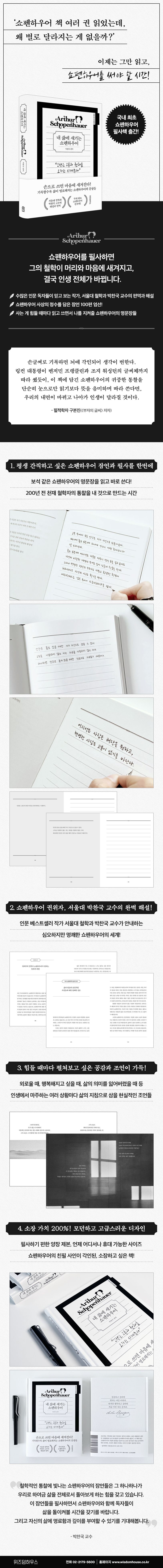 쇼펜하우어의 보석 같은 잠언을 직접 손으로 쓰며, 마음에 새길 수 있는 ‘쇼펜하우어 필사책’이 출간되'었다. 쇼펜하우어는 최근 우리나라에서 그야말로 가장 뜨거운 관심을 받고 있는 철학자다. 명쾌하고 현실적인 조언을 전하는 쇼펜하우어의 철학에 수많은 사람들이 공감하고 있는 시점에, 그의 글을 읽으며 직접 필사할 수 있는 책이다. 수많은 인문 독자들이 믿고 보는 작가인 서울대 철학과 박찬국 교수가 쇼펜하우어 사상의 정수를 담은 잠언 100편 엄선하여 번역했고, 전문적이고 친절한 해설을 더했다. 이 책을 통해 평생 삶의 지침이 되어줄 쇼펜하우어 명문장을 손으로 쓰면 그의 철학이 마음속 깊이 각인되고, 생각이 달라지며, 결국 삶의 방향을 바꿀 수 있을 것이다.