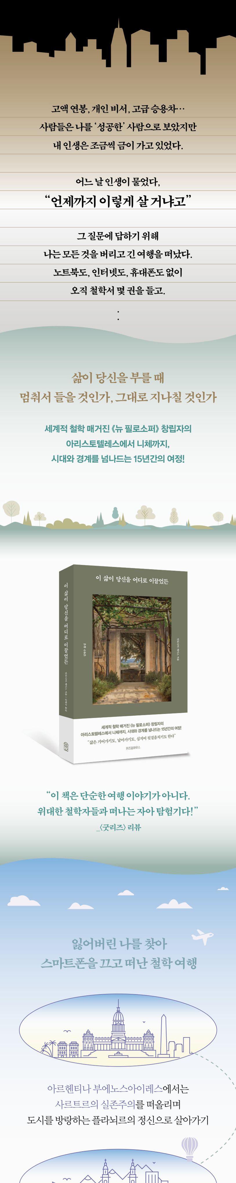 전 세계에 발행되는 철학 매거진 《뉴 필로소퍼》의 창립자이자 편집장인 안토니아 케이스가 첫 책을 출간했다. 일 중독자이자 잘나가던 커리어 우먼이었던 저자는 어느 날 인생의 의미를 찾기 위해 모든 것을 버리고 달랑 철학서 몇 권을 들고 전 세계로 여행을 떠난다. 그 15년간의 긴 여정을 고스란히 담았다. ‘현대 사회에서 우리가 추구하는 것의 실체는 무엇인가’ ‘무엇이 더 풍요로운 삶을 만드는가’ ‘진정한 나를 만드는 것은 무엇인가’ 등 인생의 의미를 둘러싼 다양한 고민을 아리스토텔레스에서 니체까지, 또 철학에서 사회학, 심리학까지 시대와 경계를 넘나들며 저자만의 독특한 시선으로 내밀하게 고찰한다. ‘이대로 살아도 괜찮을까’ 고민하고 있다면 이 책과 함께 철학 여행을 떠나보자.