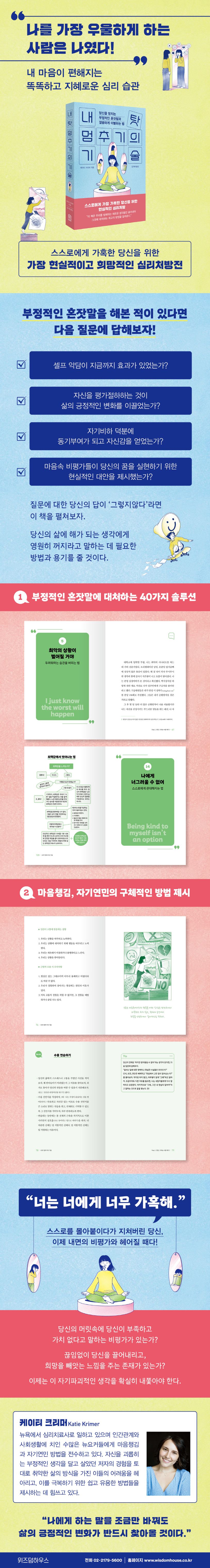 뉴욕에서 심리 치료사로 일하고 있으며, 인간관계와 사회생활에 치인 수많은 뉴요커들에게 마음챙김과 자기연민 방법을 전수하고 있는 저자 케이티 크리머는 이 책에서 부정적인 혼잣말은 내면의 쓰레기이자, 근거 없는 헛소리일 뿐이라고 직언한다. 또한, 원치 않은 상황에 직면했을 때 쉽사리 자책하거나 불안에 휩싸이게 하는 사고의 과정을 상세히 풀어주고, 그들이 빠진 생각의 함정과 잘못된 신념을 날카롭게 집어낸다. 저자의 냉철하면서도 현실적인 조언은 독자로 하여금 허술한 내면의 민낯을 직시하도록 도와준다. 어렵고 무겁게 느껴지는 심리 이론에만 머무는 것이 아니라, 일상 속에서 언제든지 실행할 수 있는 실용적인 방법을 폭넓게 담아냈다. 어제보다 더 담대하고 평온하게 내일을 살고 싶은가? 그렇다면 이 책을 곁에 두고 꾸준히 부정적인 혼잣말을 지혜롭게 길들이는 방법을 연습해보기를 권한다. 분명 당신의 삶에 놀라운 변화가 일어날 것이다.