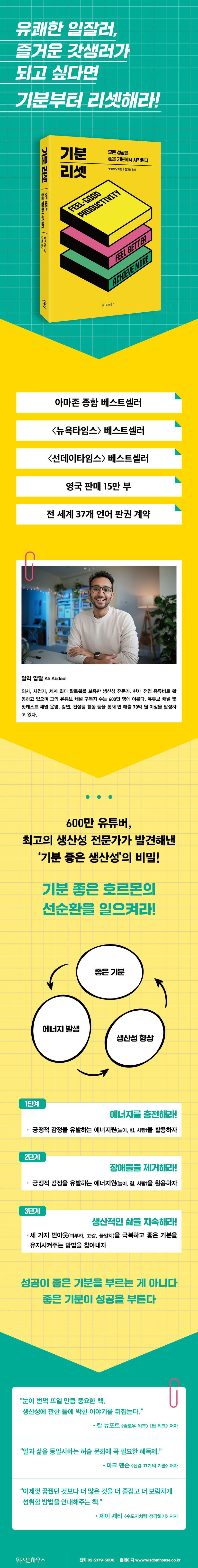 여기, 더 쉽고 더 행복하게 생산성을 극대화하고 성공과 행복에 도달하는 길이 있다. 세계에서 팔로워가 가장 많은 생산성 전문가이자 600만 유튜버 알리 압달은 수십 년간 축적된 심리학계의 연구 결과를 분석하고 이를 바탕으로 스스로 다양한 일과 프로젝트를 병행하며 생산성을 향상하기 위해 애써온 결과, 마침내 새로운 비결을 찾아냈다. 바로 ‘기분 좋은 생산성(feel-good productivity)’으로, 뭐든 기분 좋게 할 수 있다면 생산성은 저절로 좋아진다는 것이다. 《기분 리셋》에서 알리 압달은 우리가 기분 좋은 생산성의 과학적 원리를 활용하면 삶을 어떻게 바꿀 수 있는지 보여준다. 기분 좋은 생산성으로 나아가기 위해 마인드셋을 전환하고 저자가 알려주는 간단하면서도 다양한 행동 지침을 따라 하다 보면 어느새 더 많은 것을 성취하고 더 나은 삶을 살 수 있을 것이다.