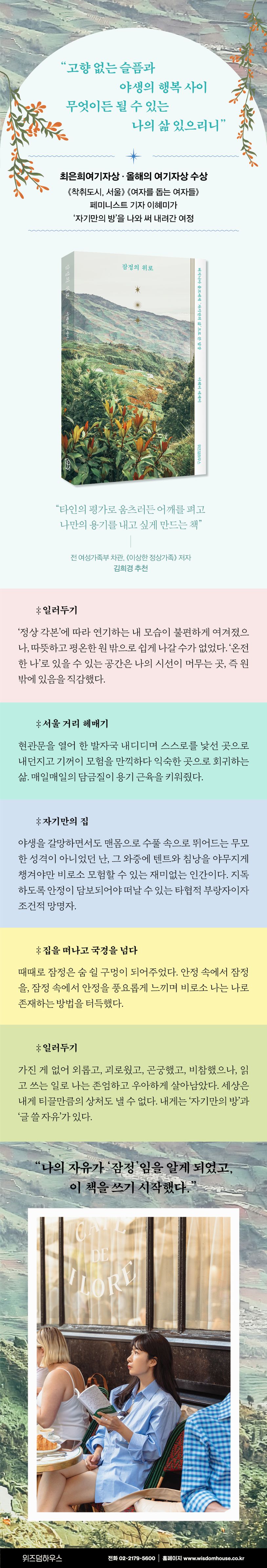 1만여 독자에게 젠더ㆍ페미니즘 뉴스레터를 보내며 동시대를 살아가는 여성들과 함께 해방할 길을 모색하는 이혜미 기자의 신작 에세이. 저자는 약 100년 전 영국에 살던 버지니아 울프의 에세이 《자기만의 방》에서 열두 문장을 가려 뽑아 현대 대한민국을 살아가는 여성으로서 답장을 썼다. 책 속에는 안정적이고 풍요로운 ‘자기만의 방’을 뒤로하고 잠정의 자리에서 써 내려간 ‘자기만의 삶’이 담겨 있다.