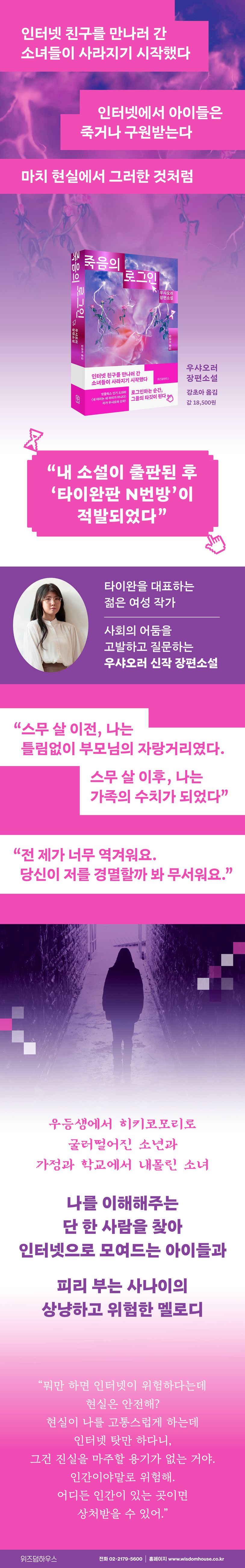 타이완을 대표하는 사회파 미스터리 작가 우샤오러의 신작 장편소설 《죽음의 로그인》이 위즈덤하우스에서 출간되었다. 불의의 사고로 가족의 자랑에서 가족의 수치로 굴러떨어진 ‘천신한’과, 가정과 학교에서 내몰려 평범한 행복을 누리지 못하고 살아가는 ‘루이안’은 얼굴 한번 본 적 없지만 게임에서 우정을 나눠온 유일한 친구다. 어느 날 죽음의 안개가 루이안을 덮치고, 천신한은 루이안을 구하기 위해 게임에서 단서를 찾아가기 시작한다.