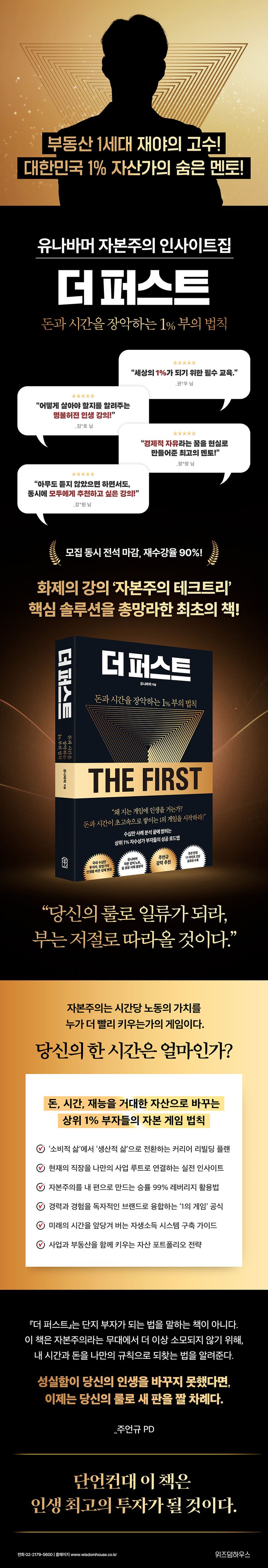 『더 퍼스트』는 유나바머의 자본주의 테크트리 맵을 토대로, 평범한 사람들이 실질적으로 적용할 수 있는 자본 게임의 법칙을 6단계로 전한다. 근로소득 외 수익 창출법부터 평생 마르지 않는 현금 흐름을 만드는 법까지, 시장의 위기에도 절대 무너지지 않는 부의 사다리를 완성하는 핵심 원칙을 빠짐없이 담았다. 30대 초반 사업과 투자를 시작해 경제적 자유를 이룬 저자의 경험과 노하우, 수강생들의 성공 사례까지 총망라해, 직무 · 나이 · 자산 상황에 특화된 ‘맞춤형 자본 게임’을 설계하도록 돕는다.