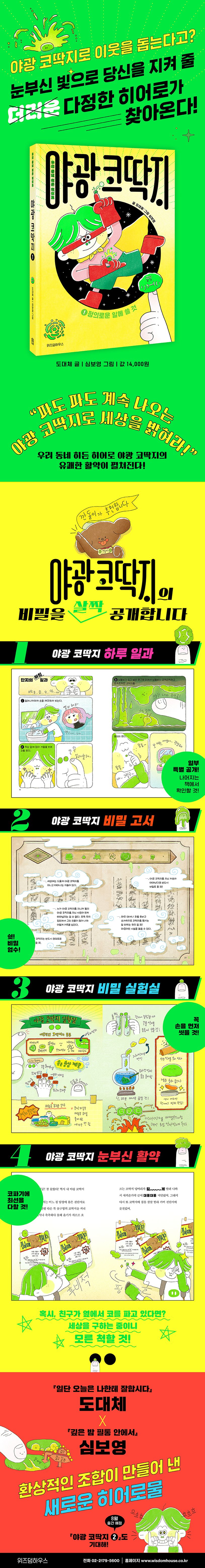 대한민국의 평범한 아홉 살 단지에게는 놀라운 비밀이 있다. 바로 코딱지가 반짝반짝 빛나는 야광이라는 사실! 집안에 내려오는 고서에 따르면, 세상에는 드물게 야광 코딱지를 지닌 이들이 태어난다. 단지네 집안에 유독 그런 사람들이 많아 조상님들은 야광 코딱지를 사용할 때 지켜야 할 규칙과 야광 코딱지 활용 비법, 실제 야광 코딱지 사용 사례 등을 책으로 남겨 두었다. 오늘도 단지는 ‘야광 코딱지는 정의로운 일에 써야 한다’라는 가르침에 따라 어려움에 처한 이웃을 돕기 위해 야광 코딱지를 가지고 출동한다. 더러운 아니아니 다정한 우리 동네 히든 히어로 야광 코딱지의 눈부신 활약을 만나 보자.