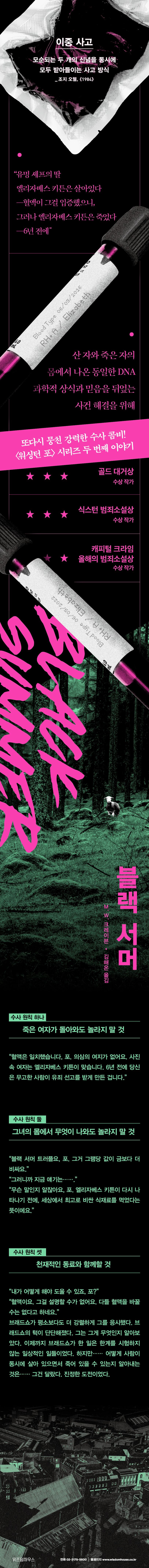 유명셰프의딸엘리자베스키튼은살아있다―혈액이그걸입증했으니.그러나엘리자베스키튼은죽었다―6년전에.독자의부름에더욱강력해져돌아온수사콤비!《퍼핏쇼》의폭풍을이을‘워싱턴포’두번째시리즈출간★골드대거상수상작가★식스턴범죄소설상수상작가★캐피털크라임올해의범죄소설상수상작가미국의유명미스터리소설가“해리보슈에대한영국의답”이라는평을받으며,“잔혹하면서도스릴넘치는페이지터너”이자“최고로유쾌한피투성이이야기”(〈선데이미러〉)로각종권위의장르소설상을휩쓸어온M.W.크레이븐의장편소설《블랙서머》가위즈덤하우스에서출간된다.《블랙서머》는2023년출간된《퍼핏쇼》의후속작이자‘워싱턴포’시리즈두번째책이다.《퍼핏쇼》를읽은독자들은날카로운감각의형사워싱턴포와천재프로파일러틸리브래드쇼“콤비의활약에얼른다음책이나왔으면”하고바라면서,“후속작을알리는영리한장치와결말이깊은여운을남긴다”며시리즈에대한기대감을아낌없이밝혀왔다.산자와죽은자의몸속에서나온동일한DNA과학적상식과믿음을뒤엎는이중사고의함정‘이중사고’란조지오웰의《1984》에서파생된개념으로모순되는두개의신념을동시에모두받아들이는사고를말한다.바야흐로6년전,중범죄수사국형사워싱턴포는고급레스토랑에서벌어진잔혹한살인사건의신고를받고현장을찾는다.누구든살아서나갔을리없어보이는피투성이의주방,그리고사라진시신.포는당시사건의용의자로피해자엘리자베스키튼의친부이자레스토랑‘벌리스앤드슬로’의오너인스타셰프재러드키튼을지목한다.비록엘리자베스의시신은찾을수없었지만알리바이의맹점과치사량이상의혈흔을증거로키튼은수감되고6년이란시간이흐른현재.워싱턴포의눈앞에자신이죽은엘리자베스키튼이라고주장하는여성이등장한다.그녀의혈액에서엘리자베스키튼의DNA가검출되고,포는집요한수사끝에혈액증거물은결코조작될수없었음을확인한다.포는태어나처음으로‘이중사고’라는말을,그가좋아하는책조지오웰《1984》에서처음쓰인그문구를이해하게되었다.그것은두가지모순되는생각을동시에믿는다는뜻이었다.엘리자베스키튼은살아있었다―혈액이그걸입증했으니.그러나엘리자베스키튼은죽었다―그는확신했다._본문에서“블랙서머트러플요,포.그거그램당값이금보다더비싸요.”사이코패스살인마가흘리고간단하나의단서를추격하다수사를거듭할수록미궁에빠져드는포를위해그의동료이자천재적인프로파일러틸리브래드쇼와병리학자에스텔도일이나서고두사람은각각맡은과제를풀기위해분투한다.틸리브래드쇼는경찰조사이후또다시종적을감춘엘리자베스의신원을파악하고자위장수사를감행하고,에스텔도일은엘리자베스의DNA가숨기고있는실낱같은무언가를찾기위해혈액속을파고든다.그러던어느날에스텔도일이엘리자베스키튼의몸에서나와서는안될물질을찾았다며전화를해오는데…….자신의손으로무고한피해자를만들었다는포의죄책감과그럼에도재러드키튼에게서풍기는살인의위화감사이사건의진실을향한치열한공방이시작된다.“그래요,포.능력이부족한병리학자였다면알아채지못했을지모르지만,전에도얘기했듯이나는그런병리학자가아니에요.그건THC가아니라전혀다른물질이었어요.투버아에스티붐(Tuberasestivum)에서만발견되는화학물질이었어요.”“투버아에스티붐?”“블랙서머트러플요,포.그거그램당값이금보다더비싸요.”“그러니까지금얘기는…….”“무슨말인지알잖아요,포.엘리자베스키튼이앨스턴도서관에나타나기전에세상에서최고로비싼식재료를먹었다는뜻이에요.”_본문에서참신하고통쾌한문학적체험,위즈덤하우스‘워싱턴포’시리즈2018년출간즉시다음해영국추리작가협회(CWA)에서주관하는영미범죄문학최고의영광‘골드대거상’을수상한《퍼핏쇼》는‘포&틸리’시리즈라불리며,《셜록홈즈》의셜록&왓슨이후새로운듀오의탄생을기다려온독자에게신선하고유쾌한경험을선사했다.‘워싱턴포’시리즈의매력은지금껏다뤄진적없는참신한사건과추리기법이라할수있는데,1편《퍼핏쇼》가선사유물인‘환상열석’으로불타죽은시신들과연쇄살인을연결지었다면,2편《블랙서머》는고급식재료인트러플과피해자의혈액에천착하며고도의긴장과재미를꾀한다.또한이어서출간될3편《큐레이터》에서는미술관처럼전시된시체들과아트넘버링의상관관계를집요하게파헤치며크레이븐만의발칙하고영리한추리의세계로독자를초대할예정이다.성탄절,컴브리아곳곳에시체가전시되기시작한다.그리고현장에남겨진이상한메시지.#BSC6.워싱턴포와틸리브래드쇼는사건을풀기위해가장의문스러운지점을파고든다.왜어떤피해자들은마취상태로죽고,어떤피해자들은끔찍한고통속에서목숨을잃었을까?_《큐레이터》(근간)