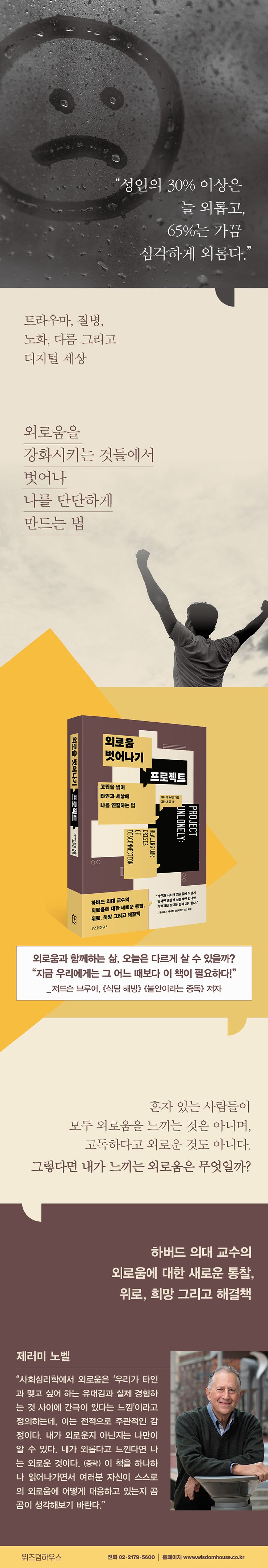 외로움을 느끼는 사람들은 이전부터 많았고, 우리는 늘 외로움을 과소평가해왔다. 혼자 있는 것과 외로움을 구분하지 못하며, 고독 역시 외로움과 같은 것이라고 생각한다. 혼자 있는 사람들이 모두 외로움을 느끼는 것은 아니며, 고독하다고 외로운 것도 아니다. 하버드 의대 교수인 제러미 노벨은 외로움의 전 세계적인 유행에 대응하기 위해 ‘외로움 벗어나기 프로젝트’를 시작한다. 그는 이 프로젝트를 통해 우리가 경험한 외로움이 어떻게 생겨나는지 그 근원을 밝히고, 어떻게 하면 외로움을 강화시키는 것들에서 벗어날 수 있는지를 알려준다. 명료한 분석 아래 따뜻한 지지를 보여주는 이 책은 그 프로젝트의 결과물이며, 새로운 외로움의 시대를 맞은 우리가 앞으로 곁에 두고 의지해야 할 지침서다.