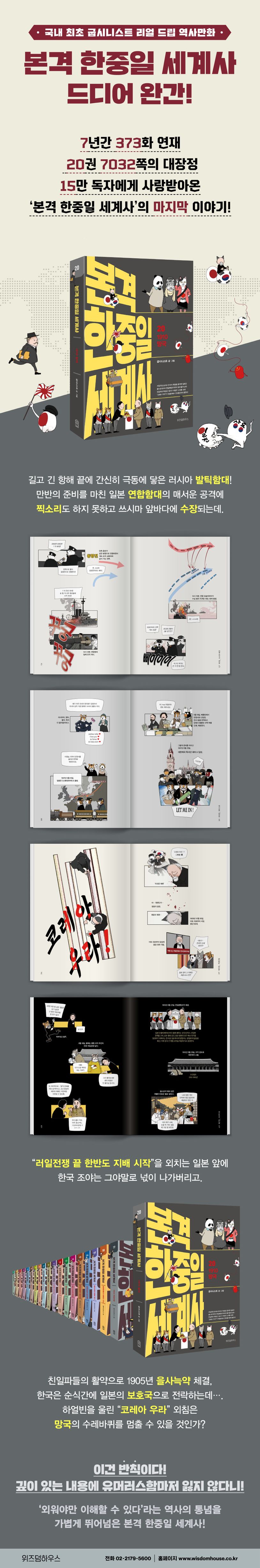 2017년부터 계속되어온 ‘본격 한중일 세계사’ 시리즈가 웹툰 기준 373화, 단행본 기준 20권 7,032쪽이라는 기나긴 대장정 끝에 완간을 맞는다. 1839년 아편전쟁부터 1910년 한일 병합까지, 동아시아 70여 년의 아수라도를 생생히 펼쳐낸 이 시리즈는 19세기 세계사를 온전히 이해하기 위한 필독서로 그간 15만 독자에게 사랑받아 왔다. 특히 ‘역사만화 본좌’로 불리는 굽시니스트의 독보적인 해석과 신선한 ‘드립’이 알맞게 버무려지며, ‘역덕’과 ‘역알못’ 모두 함께 즐길 수 있는 시리즈로 자리매김했다.