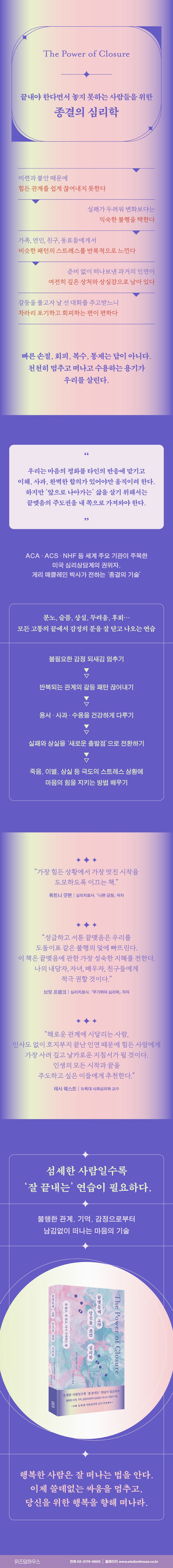 현대인은 평생에 걸쳐 ‘끝내지 못한 문제’와 씨름한다. 연인·배우자와의 반복되는 갈등, 갑작스러운 이별, 설명조차 없는 해고, 가까운 사람의 죽음, 인사 한마디 나누지 못한 채 멀어진 관계. 우리 모두가 겪는 일들이지만, 누구는 의연히 넘어서고 누구는 평생에 걸쳐 그 그림자 속에 갇힌다. 차이는 무엇일까? 바로 ‘끝맺음’의 방식이다.
