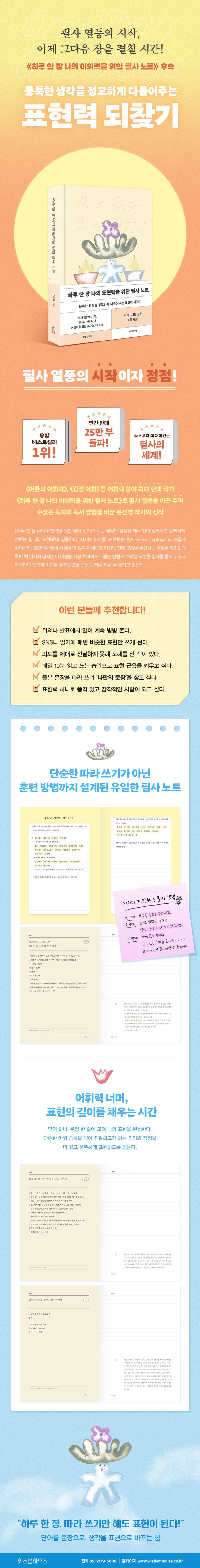 연간 25만 부라는 기록적인 판매로 필사 열풍을 일으킨 《하루 한 장 나의 어휘력을 위한 필사 노트》의 후속편이, 이번에는 ‘표현력’이라는 새로운 화두를 앞세워 독자들을 찾아온다. 자기표현의 시대가 도래하며, 생각과 감정을 왜곡 없이 정확하게 전하는 능력은 사회적 관계와 일상적 소통에서 점점 더 중요한 의미를 지닌다. 그러나 많은 사람들이 표현의 한계에 부딪히며 어려움을 겪는다. 아는 것은 많지만 막상 글이나 말로 풀어내려 하면 막히고, 한정된 표현만 반복하는 답답함을 경험한다. 특히 독서량이 적은 세대일수록 생각의 폭이 좁아지고 자기표현에도 자신감을 잃어가고 있다. 《하루 한 장 나의 표현력을 위한 필사 노트》는 이러한 문제의식에서 출발한다. 전작 《하루 한 장 나의 어휘력을 위한 필사 노트》가 ‘어휘력+필사’의 조합으로 독자의 호응을 얻었다면, 이번 책은 ‘필사+표현력’으로 확장한다. 단순히 좋은 문장을 옮겨 쓰는 데 그치지 않고 자신의 언어로 재구성하여 표현할 수 있게 돕는다. 또한 문학, 철학, 예술 등 각 분야에서 표현의 본질이 담긴 문장들이 수록되어 필사를 통해 자기 언어로 소화하고 변주하는 과정을 체험할 수 있다.