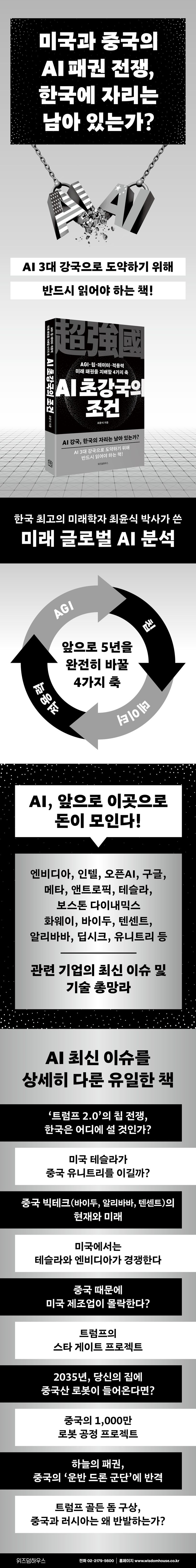 이 책에서 한국 최고의 미래학자인 최윤식 저자는 AI가 만들어낼 새로운 세계 질서를 다각도로 분석한다. 독자들은 AGI와 로봇, 데이터 중심 세계에서 지금 어떤 일이 벌어지고 있는지, 살아남기 위한 조건과 전략은 무엇인지 확인할 수 있다. 또한 AI가 소프트웨어를 넘어 현실 세계의 산업과 군사, 생활을 어떻게 재편할지 생생히 목격하고, 그 속에서 개인과 조직이 어떤 준비를 해야 할지 인사이트를 얻게 될 것이다.