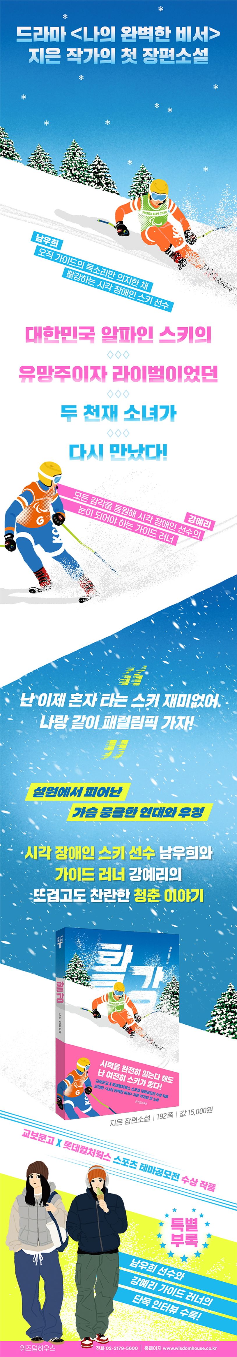 드라마 〈나의 완벽한 비서〉를 통해 로맨스를 넘어 돌봄의 가치를 재조명하며 뜨거운 찬사를 받은 지은 작가가 첫 장편소설 『활강』을 선보인다. 대한민국 알파인 스키의 유망주이자 라이벌이었던 두 천재 소녀 남우희와 강예리가 시각 장애인 선수와 가이드 러너로 다시 만나 겪게 되는 갈등과 성장을 그린 작품. 자신만의 속도로 가장 눈부신 활강을 펼쳐낼 이 땅의 모든 청춘에게 바치는 따뜻한 헌사 같은 이야기이다. 중학교 3학년 동계 체전, 모든 대회 석권을 앞두고 마지막 경기에서 불의의 사고로 시력을 잃은 남우희, 어려운 가정 형편과 지독한 슬럼프로 선수로서의 마지막 자리까지 잃은 강예리. 가장 찬란하게 빛나던 순간 깊은 추락을 경험한 두 사람은 오직 스키를 위해 서로의 손을 맞잡는다. 드라마 〈나의 완벽한 비서〉로 인물 간의 섬세한 관계 묘사로 호평을 받은 작가는 이번 작품에서도 단순히 장애와 난관을 극복하는 스포츠 드라마를 넘어, 실패와 좌절을 겪은 두 사람이 서로의 세계를 이해하고 연대하며 함께 성장하는 과정을 감동적으로 보여 준다. 책의 말미에는 작가가 독자에게 전하는 특별한 선물 같은, 스무 살이 된 남우희와 강예리의 단독 인터뷰가 수록되어 있다.