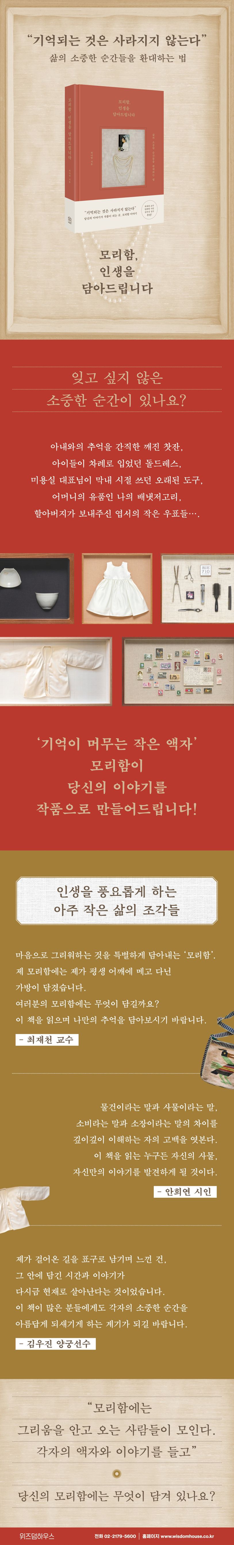 모리함에는 누군가의 사랑의 증표가, 이별의 조각이, 평생의 신념과 시간이 스며든 기억들이 도착한다. 각각의 이야기는 모리함 액자에 담겨 시간의 결을 지닌 작품으로 다시 태어난다. 이 책은 우리에게 묻는다. 당신의 모리함에는 어떤 물건이 담겨 있는지, 그리고 그 모리함에는 어떤 이야기가 깃들어 있는지 하고.